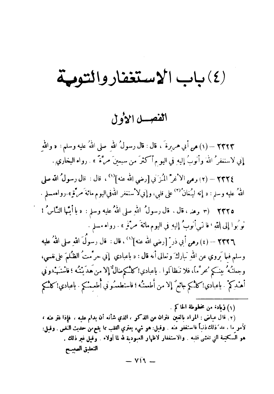 عَنْ أَبِي هُرَيْرَةَ قَالَ: قَالَ رَسُولُ اللَّهِ صَلَّى اللَّهُ عَلَيْهِ وَسَلَّمَ: «وَاللَّهِ إِنِّي لِأَسْتَغْفِرُ اللَّهَ وَأَتُوبُ إِلَيْهِ فِي الْيَوْمِ أَكْثَرَ مِنْ سبعينَ مرَّةً» . رَوَاهُ البُخَارِيّ
