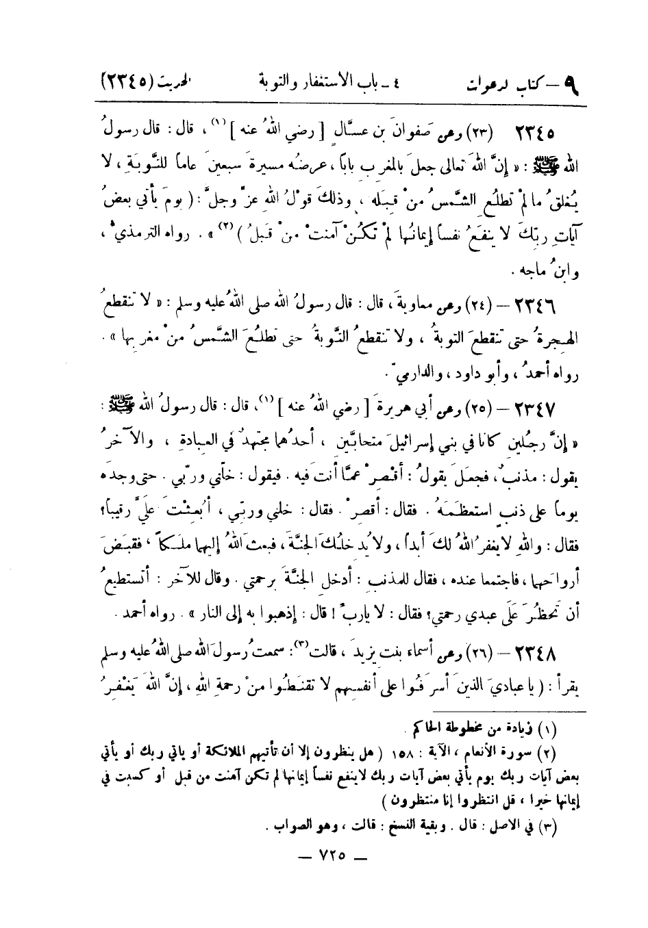 وَعَنْ صَفْوَانَ بْنِ عَسَّالٍ رَضِيَ اللَّهُ عَنْهُ قَالَ: قَالَ رَسُولُ اللَّهِ صَلَّى اللَّهُ عَلَيْهِ وَسَلَّمَ: " إِنَّ اللَّهَ تَعَالَى جَعَلَ بِالْمَغْرِبِ بَابًا عَرْضُهُ مَسِيرَةُ سَبْعِينَ عَامًا لِلتَّوْبَةِ لَا يُغْلَقُ مَا لم تطلع عَلَيْهِ الشَّمْسُ مِنْ قِبَلِهِ وَذَلِكَ قَوْلُ اللَّهِ عَزَّ وَجَلَّ: (يَوْمَ يَأْتِي بَعْضُ آيَاتِ رَبِّكَ لَا يَنْفَعُ نَفْسًا إِيمَانُهَا لَمْ تَكُنْ آمَنَتْ مِنْ قبل)