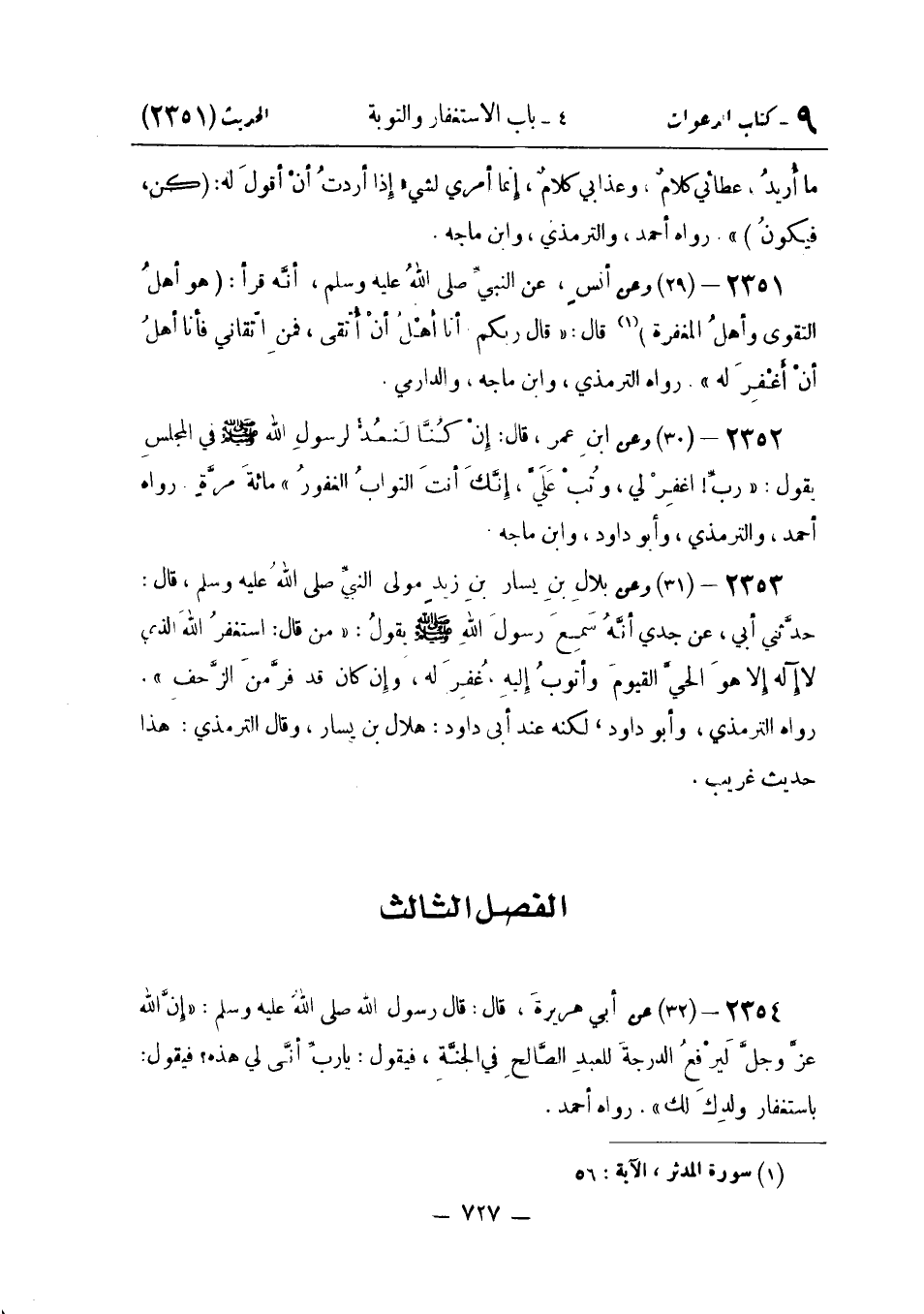 وَعَن ابْن عمر قَالَ: إِنْ كُنَّا لَنَعُدُّ لِرَسُولِ اللَّهِ صَلَّى اللَّهُ عَلَيْهِ وَسَلَّمَ فِي الْمَجْلِسِ يَقُولُ: «رَبِّ اغْفِرْ لِي وَتُبْ عَلَيَّ إِنَّكَ أَنْتَ التَّوَّابُ الْغَفُورُ» مِائَةَ مَرَّةٍ. رَوَاهُ أَحْمَدُ وَالتِّرْمِذِيُّ وَأَبُو دَاوُدَ وَابْنُ مَاجَهْ
