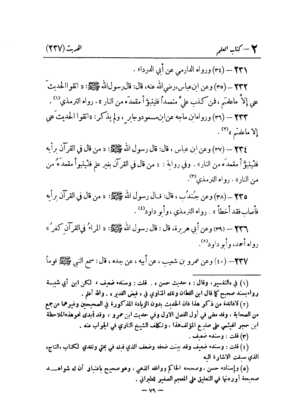 وَعَنِ ابْنِ عَبَّاسٍ قَالَ: قَالَ رَسُولُ اللَّهِ صَلَّى اللَّهُ عَلَيْهِ وَسَلَّمَ: «مَنْ قَالَ فِي الْقُرْآنِ بِرَأْيِهِ فَلْيَتَبَوَّأْ مَقْعَدَهُ مِنَ النَّارِ» . وَفِي رِوَايَةٍ: «مَنْ قَالَ فِي الْقُرْآنِ بِغَيْرِ عِلْمٍ فَليَتَبَوَّأ مَقْعَده من النَّار» رَوَاهُ التِّرْمِذِيّ