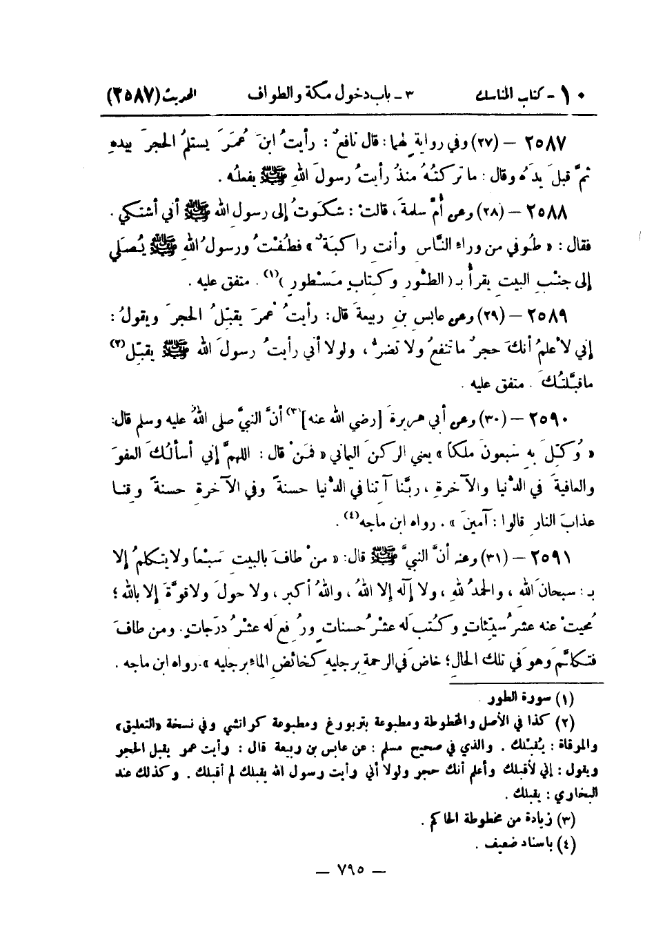 وَعَنْهُ أَنَّ النَّبِيَّ صَلَّى اللَّهُ عَلَيْهِ وَسَلَّمَ قَالَ: " مَنْ طَافَ بِالْبَيْتِ سَبْعًا وَلَا يَتَكَلَّمُ إِلَّا بِ: سُبْحَانَ اللَّهِ وَالْحَمْدُ لِلَّهِ وَلَا إِلَهَ إِلَّا اللَّهُ وَاللَّهُ أَكْبَرُ وَلَا حَوْلَ وَلَا قُوَّةَ إِلَّا بِاللَّهِ مُحِيَتْ عَنْهُ عَشْرُ سَيِّئَاتٍ وَكُتِبَ لَهُ عَشْرُ حَسَنَاتٍ وَرُفِعَ لَهُ عَشْرُ دَرَجَاتٍ. وَمَنْ طَافَ فَتَكَلَّمَ وَهُوَ فِي تِلْكَ الْحَالِ خَاضَ فِي الرَّحْمَةِ بِرِجْلَيْهِ كَخَائِضِ الماءِ برجليه ". رَوَاهُ ابْن مَاجَه