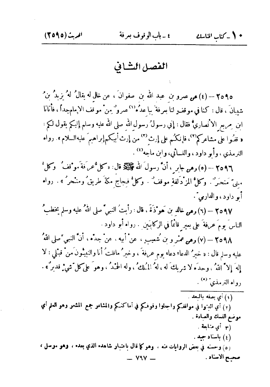 عَنْ عَمْرِو بْنِ عَبْدِ اللَّهِ بْنِ صَفْوَانَ عَنْ خَالٍ لَهُ يُقَالُ لَهُ يَزِيدُ بْنُ شَيْبَانَ قَالَ: كُنَّا فِي مَوْقِفٍ لَنَا بِعَرَفَةَ يُبَاعِدُهُ عَمْرٌو مِنْ مَوْقِفِ الْإِمَامِ جِدًّا فَأَتَانَا ابْنُ مِرْبَعٍ الْأَنْصَارِيُّ فَقَالَ: إِنِّي رَسُولُ رَسُولِ اللَّهِ صَلَّى اللَّهُ عَلَيْهِ وَسَلَّمَ إِلَيْكُمْ يَقُولُ لَكُمْ: «قِفُوا عَلَى مَشَاعِرِكُمْ فَإِنَّكُمْ عَلَى إِرْثِ من إِرْثِ أَبِيكُمْ إِبْرَاهِيمَ عَلَيْهِ السَّلَامُ» . رَوَاهُ التِّرْمِذِيُّ وَأَبُو دَاوُدَ وَالنَّسَائِيُّ وَابْنُ مَاجَهْ