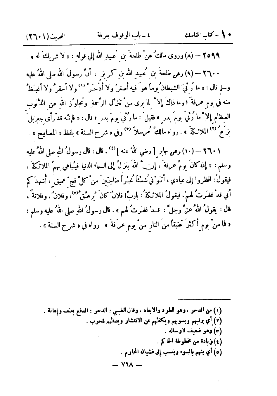 لإرساله وَعَنْ طَلْحَةَ بْنِ عُبَيْدِ اللَّهِ بْنِ كَرِيزٍ أَنَّ رَسُولَ اللَّهِ صَلَّى اللَّهُ عَلَيْهِ وَسَلَّمَ قَالَ: «مَا رُئِيَ الشَّيْطَانُ يَوْمًا هُوَ فِيهِ أَصْغَرُ وَلَا أَدْحَرُ وَلَا أَحْقَرُ وَلَا أَغْيَظُ مِنْهُ فِي يَوْمِ عَرَفَةَ وَمَا ذَاكَ إِلَّا لِمَا يَرَى مِنْ تَنَزُّلِ الرَّحْمَةِ وَتَجَاوُزِ اللَّهِ عَنِ الذُّنُوبِ الْعِظَامِ إِلَّا مَا رُئِيَ يَوْمَ بَدْرٍ» . فَقِيلَ: مَا رُئِيَ يَوْمَ بَدْرٍ؟ قَالَ: «فَإِنَّهُ قَدْ رَأَى جِبْرِيلَ يَزَعُ الْمَلَائِكَةَ» . رَوَاهُ مَالِكٌ مُرْسَلًا وَفِي شَرْحِ السُّنَّةِ بِلَفْظِ الْمَصَابِيحِ