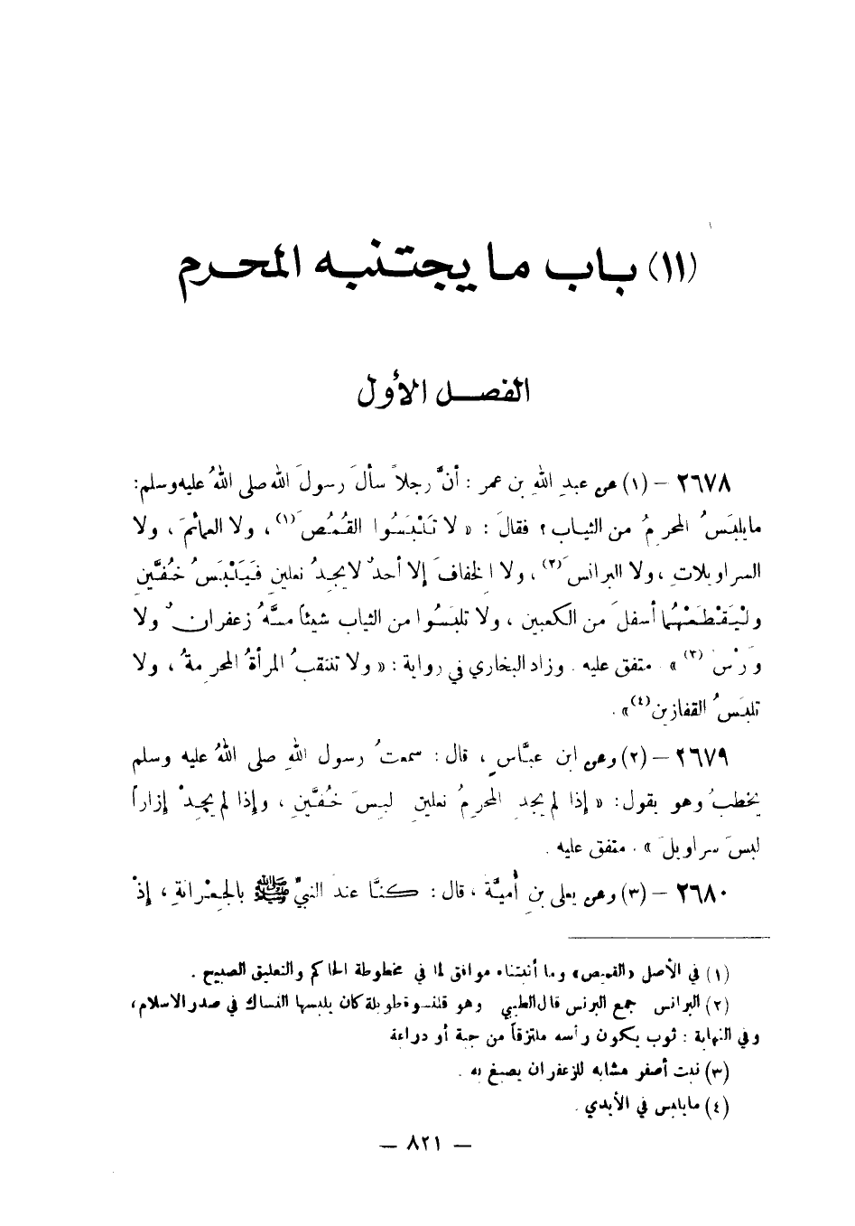 عَنْ عَبْدِ اللَّهِ بْنِ عُمَرَ: أَنَّ رَجُلًا سَأَلَ رَسُولَ اللَّهِ صَلَّى اللَّهُ عَلَيْهِ وَسَلَّمَ: مَا يلبس مِنَ الثِّيَابِ؟ فَقَالَ: «لَا تَلْبَسُوا الْقُمُصَ وَلَا الْعَمَائِمَ وَلَا السَّرَاوِيلَاتِ وَلَا الْبَرَانِسَ وَلَا الْخِفَافَ إِلَّا أَحَدٌ لَا يَجِدُ نَعْلَيْنِ فَيَلْبَسُ خُفَّيْنِ وليقطعهما أَسْفَل الْكَعْبَيْنِ وَلَا تَلْبَسُوا مِنَ الثِّيَابِ شَيْئًا مَسَّهُ زَعْفَرَانٌ وَلَا وَرْسٌ» . مُتَّفَقٌ عَلَيْهِ وَزَادَ الْبُخَارِيُّ فِي رِوَايَةٍ: «وَلَا تَنْتَقِبُ الْمَرْأَةُ الْمُحْرِمَةُ وَلَا تلبس القفازين»