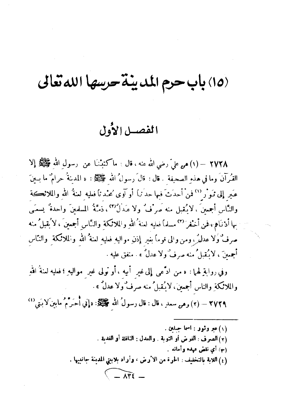 عَنْ عَلِيٍّ رَضِيَ اللَّهُ عَنْهُ قَالَ: مَا كَتَبْنَا عَنْ رَسُولِ اللَّهِ صَلَّى اللَّهُ عَلَيْهِ وَسَلَّمَ إِلَّا الْقُرْآنَ وَمَا فِي هَذِهِ الصَّحِيفَةِ قَالَ: قَالَ رَسُولُ اللَّهِ صَلَّى اللَّهُ عَلَيْهِ وَسلم: «الْمَدِينَةُ حَرَامٌ مَا بَيْنَ عَيْرٍ إِلَى ثَوْرٍ فمنْ أحدَثَ فِيهَا حَدَثًا أَوْ آوَى مُحْدِثًا فَعَلَيْهِ لَعْنَةُ اللَّهِ وَالْمَلَائِكَةِ وَالنَّاسِ أَجْمَعِينَ لَا يُقْبَلُ مِنْهُ صَرْفٌ وَلَا عَدْلٌ ذمَّةُ المسلمينَ واحدةٌ يَسْعَى بِهَا أَدْنَاهُمْ فَمَنْ أَخْفَرَ مُسْلِمًا فَعَلَيْهِ لَعْنَةُ اللَّهِ وَالْمَلَائِكَةِ وَالنَّاسِ أَجْمَعِينَ لَا يُقْبَلُ مِنْهُ صَرْفٌ وَلَا عَدْلٌ وَمَنْ وَالَى قَوْمًا بِغَيْرِ إِذْنِ مَوَالِيهِ فَعَلَيْهِ لَعْنَةُ اللَّهِ وَالْمَلَائِكَةِ وَالنَّاسِ أَجْمَعِينَ لَا يُقْبَلُ مِنْهُ صَرْفٌ وَلَا عدل»