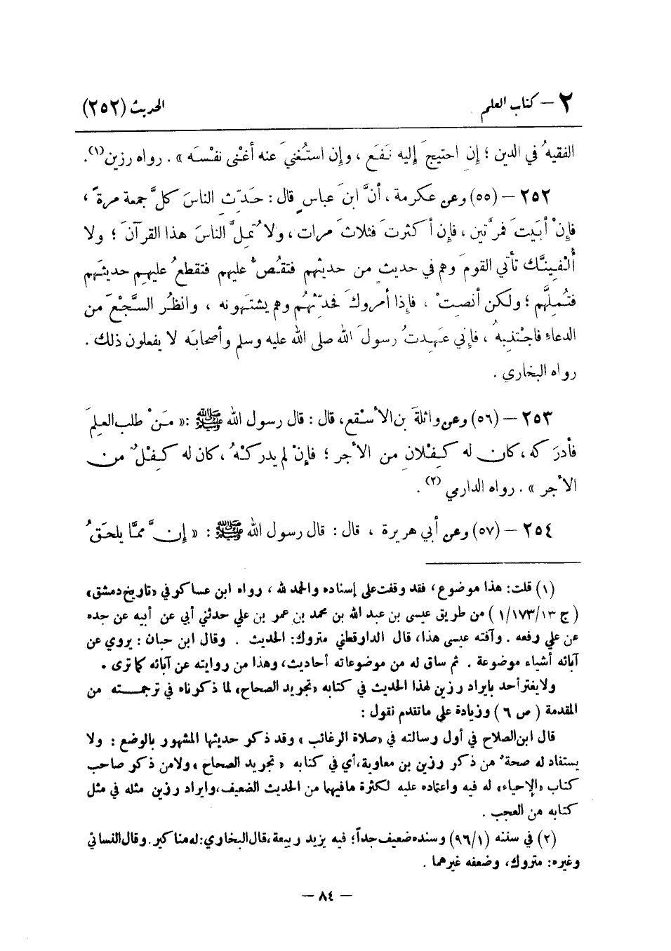 عَنْ أَبِي هُرَيْرَةَ قَالَ: قَالَ رَسُولُ اللَّهِ صَلَّى اللَّهُ عَلَيْهِ وَسَلَّمَ: «إِنَّ مِمَّا يَلْحَقُ -[85]- الْمُؤْمِنَ مِنْ عَمَلِهِ وَحَسَنَاتِهِ بَعْدَ مَوْتِهِ عِلْمًا علمه ونشره وَولدا صَالحا تَركه ومصحفا وَرَّثَهُ أَوْ مَسْجِدًا بَنَاهُ أَوْ بَيْتًا لِابْنِ السَّبِيلِ بَنَاهُ أَوْ نَهْرًا أَجْرَاهُ أَوْ صَدَقَةً أخرجهَا من مَاله فِي صِحَّته وحياته يلْحقهُ من بعد مَوته» . رَوَاهُ بن مَاجَه وَالْبَيْهَقِيّ فِي شعب الْإِيمَان