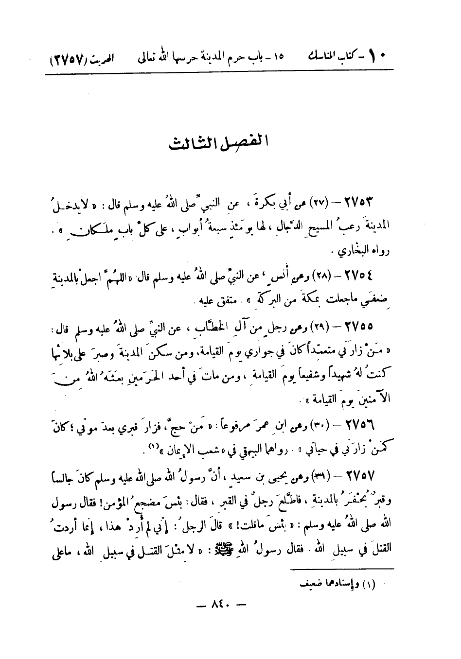 وَعَنْ رَجُلٍ مِنْ آلِ الْخَطَّابِ عَنِ النَّبِيِّ صَلَّى اللَّهُ عَلَيْهِ وَسَلَّمَ قَالَ: «مَنْ زَارَنِي مُتَعَمِّدًا كَانَ فِي جِوَارِي يَوْمَ الْقِيَامَةِ وَمَنْ سَكَنَ الْمَدِينَةَ وَصَبَرَ عَلَى بَلَائِهَا كُنْتُ لَهُ شَهِيدًا وَشَفِيعًا يَوْمَ الْقِيَامَةِ وَمَنْ مَاتَ فِي أَحَدِ الْحَرَمَيْنِ بَعَثَهُ اللَّهُ مِنَ الْآمِنِينَ يَوْمَ الْقِيَامَة»