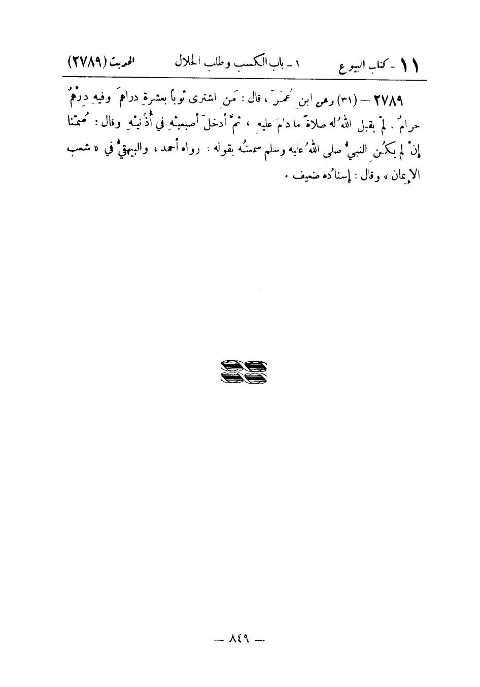 وَعَن ابنِ عُمَرَ قَالَ: مَنِ اشْتَرَى ثَوْبًا بِعَشَرَةِ دَرَاهِمَ وَفِيهِ دِرْهَمٌ حَرَامٌ لَمْ يَقْبَلِ اللَّهُ لَهَ صَلَاةً مَا دَامَ عَلَيْهِ ثُمَّ أَدْخَلَ أُصْبَعَيْهِ فِي أُذُنَيْهِ وَقَالَ صُمَّتَا إِنْ لَمْ يَكُنِ النَّبِيُّ صَلَّى اللَّهُ عَلَيْهِ وَسَلَّمَ سَمِعْتُهُ يَقُولُهُ. رَوَاهُ أَحْمَدُ وَالْبَيْهَقِيُّ فِي شُعَبِ الْإِيمَانِ. وَقَالَ: إِسْنَادُهُ ضَعِيف