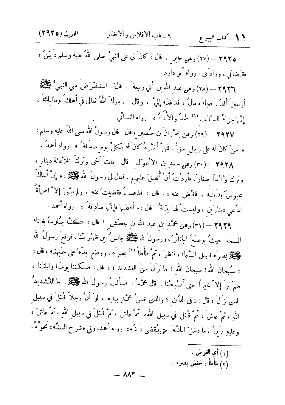 وَعَنْ مُحَمَّدِ بْنِ عَبْدِ اللَّهِ بْنِ جَحْشٍ قَالَ: كُنَّا جُلُوسًا بِفِنَاءِ الْمَسْجِدِ حَيْثُ يُوضَعُ الْجَنَائِز وَرَسُول الله جَالِسٌ بَيْنَ ظَهْرَيْنَا فَرَفَعَ رَسُولُ اللَّهِ صَلَّى اللَّهُ عَلَيْهِ وَسَلَّمَ بَصَره قبل السَّمَاء فَنظر ثُمَّ طَأْطَأَ بَصَرَهُ وَوَضَعَ يَدَهُ عَلَى جَبْهَتِهِ قَالَ: «سُبْحَانَ الله سُبْحَانَ الله مَا نَزَلَ مِنَ التَّشْدِيدِ؟» قَالَ: فَسَكَتْنَا يَوْمَنَا وَلَيْلَتَنَا فَلَمْ نَرَ إِلَّا خَيْرًا حَتَّى أَصْبَحْنَا قَالَ مُحَمَّدٌ: فَسَأَلْتُ رَسُولُ اللَّهِ صَلَّى اللَّهُ عَلَيْهِ وَسَلَّمَ: مَا التَّشْدِيدُ الَّذِي نَزَلَ؟ قَالَ: «فِي الدَّيْنِ وَالَّذِي نَفْسُ مُحَمَّدٍ بِيَدِهِ لَوْ أَنَّ رَجُلًا قُتِلَ فِي سَبِيلِ اللَّهِ ثُمَّ عَاشَ ثُمَّ قُتِلَ فِي سَبِيلِ اللَّهِ ثُمَّ عَاشَ ثُمَّ قُتِلَ فِي سَبِيلِ اللَّهِ ثُمَّ عَاشَ وَعَلَيْهِ دَيْنٌ مَا دَخَلَ الْجَنَّةَ حَتَّى يُقْضَى دَيْنُهُ» . رَوَاهُ أَحْمَدُ وَفِي شَرْحِ السُّنَّةِ نَحْوَهُ