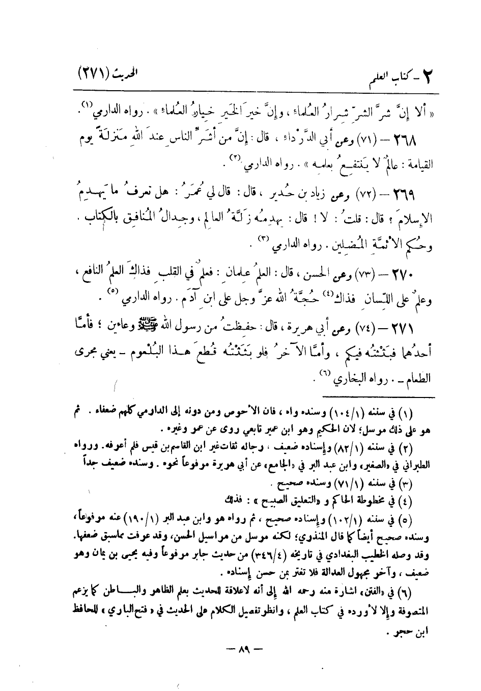 وَعَن الْحسن قَالَ: «الْعِلْمُ عِلْمَانِ فَعِلْمٌ فِي الْقَلْبِ فَذَاكَ الْعلم النافع وَعلم على اللِّسَان فَذَاك حُجَّةُ اللَّهِ عَزَّ وَجَلَّ عَلَى ابْنِ آدَمَ» . رَوَاهُ الدَّارمِيّ