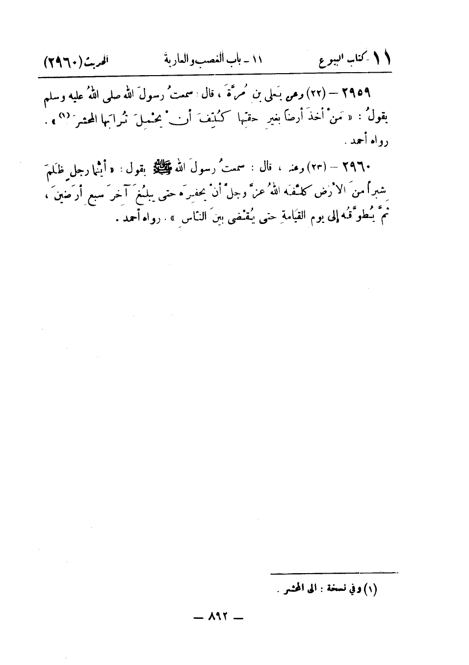 وَعَنْهُ قَالَ: سَمِعْتُ رَسُولَ اللَّهِ صَلَّى اللَّهُ عَلَيْهِ وَسَلَّمَ يَقُولُ: «أَيُّمَا رَجُلٍ ظَلَمَ شِبْرًا مِنَ الْأَرْضِ كَلَّفَهُ اللَّهُ عَزَّ وَجَلَّ أَنْ يَحْفِرَهُ حَتَّى يَبْلُغَ آخِرَ سَبْعِ أَرَضِينَ ثُمَّ يُطَوَّقَهُ إِلَى يَوْمِ الْقِيَامَةِ حَتَّى يُقْضَى بَيْنَ النَّاس» . رَوَاهُ أَحْمد