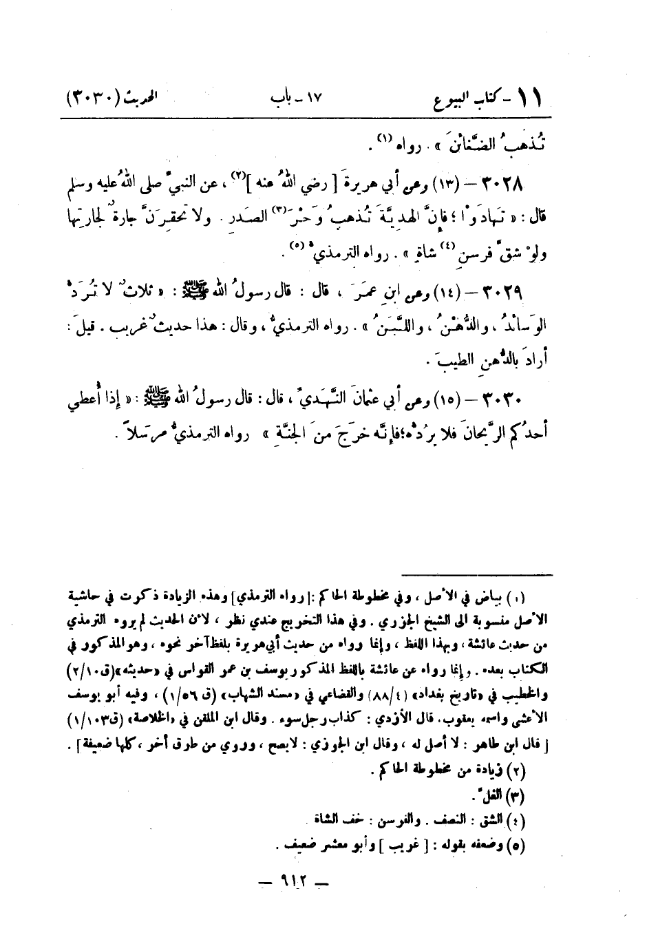 وَعَنْ أَبِي هُرَيْرَةَ رَضِيَ اللَّهُ عَنْهُ عَنِ النَّبِيِّ صَلَّى اللَّهُ عَلَيْهِ وَسَلَّمَ قَالَ: «تهادوا فَإِنَّ الْهَدِيَّةَ تُذْهِبُ وَحَرَ الصَّدْرِ وَلَا تَحْقِرَنَّ جَارَةٌ لجارتها وَلَا شقّ فرسن شَاة» . رَوَاهُ التِّرْمِذِيّ