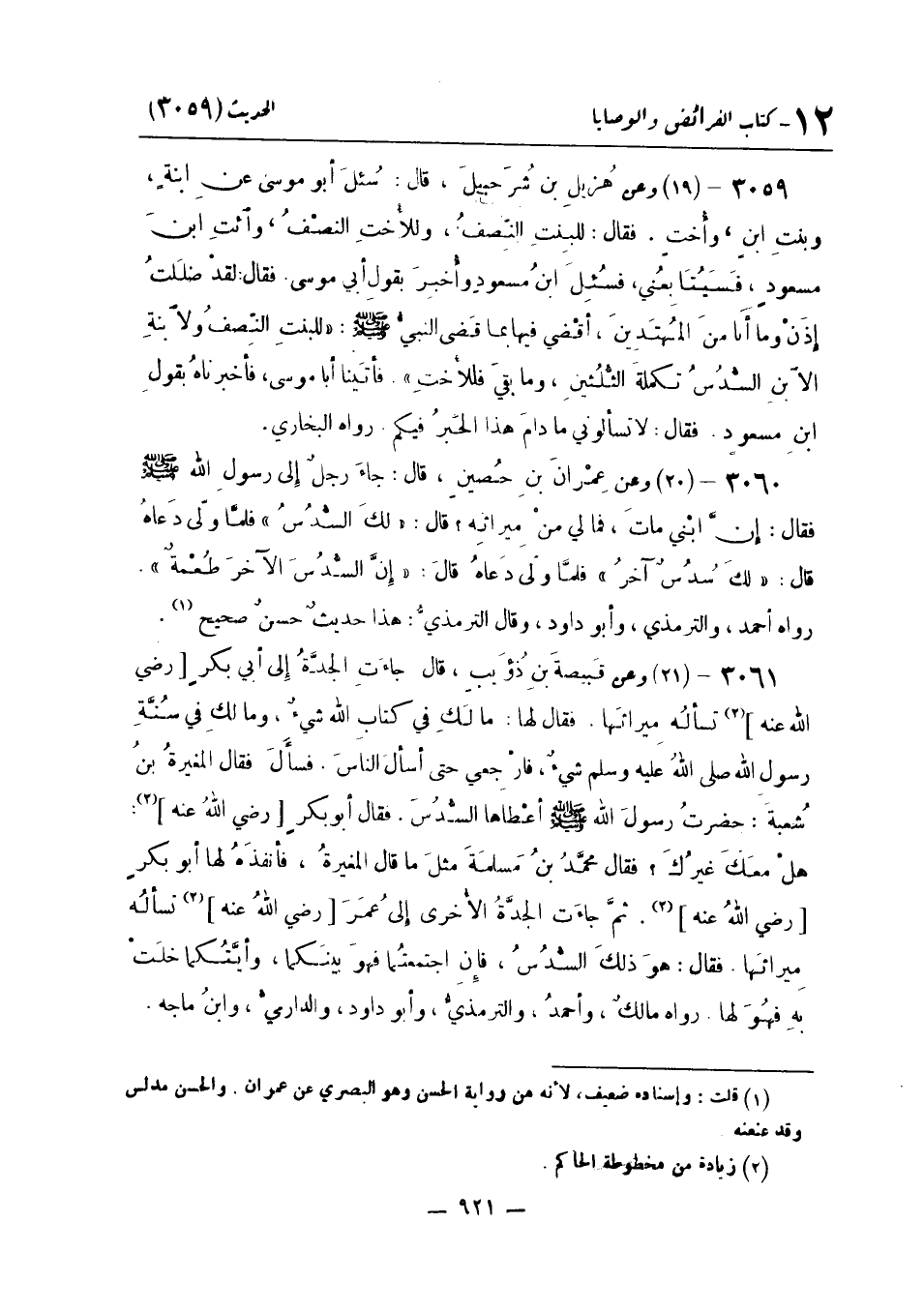 وَعَنْ عِمْرَانَ بْنِ حُصَيْنٍ قَالَ: جَاءَ رَجُلٌ إِلَى رَسُولِ اللَّهِ صَلَّى اللَّهُ عَلَيْهِ وَسَلَّمَ فَقَالَ: إِن ابْنِي مَاتَ فَمَا لِي مِنْ مِيرَاثِهِ؟ قَالَ: «لَكَ السُّدُسُ» فَلَمَّا وَلَّى دَعَاهُ قَالَ: «لَكَ سُدُسٌ آخَرُ» فَلَمَّا وَلَّى دَعَاهُ قَالَ: «إِنَّ السُّدُسَ الْآخَرَ طُعْمَةٌ» . رَوَاهُ أَحْمَدُ وَالتِّرْمِذِيُّ وَأَبُو دَاوُدَ وَقَالَ التِّرْمِذِيُّ: هَذَا حَدِيثٌ حَسَنٌ صَحِيحٌ