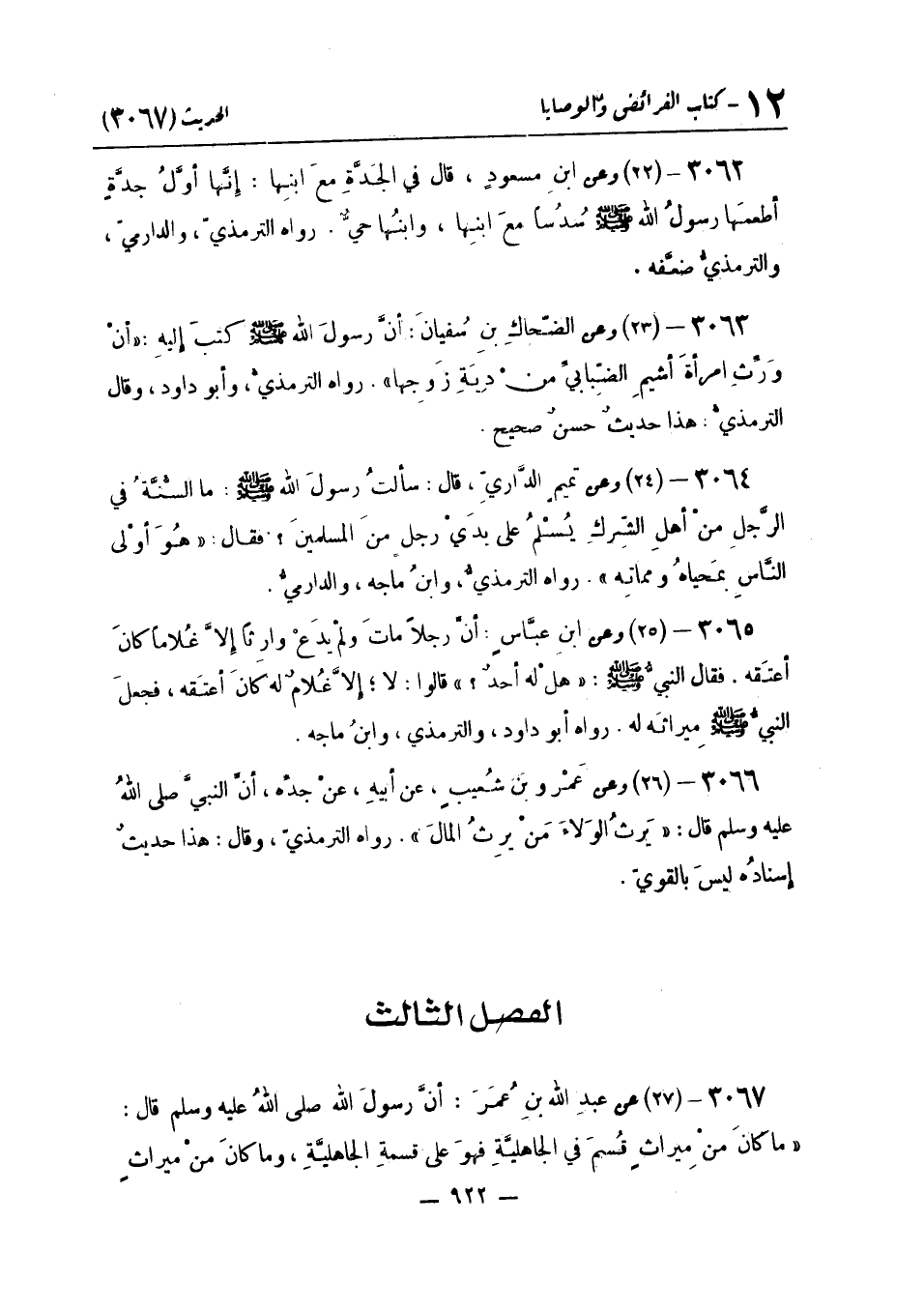 وَعَنِ ابْنِ مَسْعُودٍ قَالَ فِي الْجَدَّةِ مَعَ ابْنِهَا: أَنَّهَا أَوَّلُ جَدَّةٍ أَطْعَمَهَا رَسُولُ اللَّهِ صَلَّى اللَّهُ عَلَيْهِ وَسَلَّمَ سُدُسًا مَعَ ابْنِهَا وَابْنُهَا حَيٌّ. رَوَاهُ التِّرْمِذِيُّ وَالدَّارِمِيُّ وَالتِّرْمِذِيُّ ضَعَّفَهُ