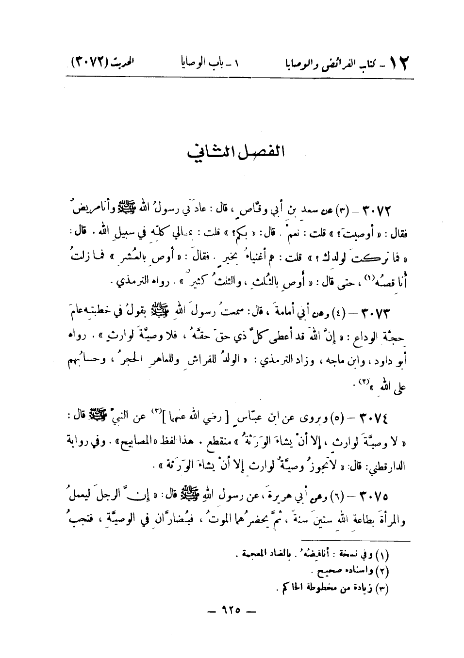 عَن سَعْدِ بْنِ أَبِي وَقَّاصٍ قَالَ: عَادَنِي رَسُولُ اللَّهِ صَلَّى اللَّهُ عَلَيْهِ وَسَلَّمَ وَأَنَا مَرِيضٌ فَقَالَ: «أَوْصَيْتَ؟» قُلْتُ: نَعَمْ قَالَ: «بِكَمْ؟» قُلْتُ: بِمَالِي كُلِّهِ فِي سَبِيلِ اللَّهِ. قَالَ: «فَمَا تَرَكْتَ لِوَلَدِكَ؟» قُلْتُ: هُمْ أَغْنِيَاءُ بِخَيْرٍ. فَقَالَ: «أوص بالعشر» فَمَا زَالَت أُنَاقِصُهُ حَتَّى قَالَ: «أَوْصِ بِالثُّلُثِ وَالثُّلُثُ كَثِيرٌ» . رَوَاهُ التِّرْمِذِيّ