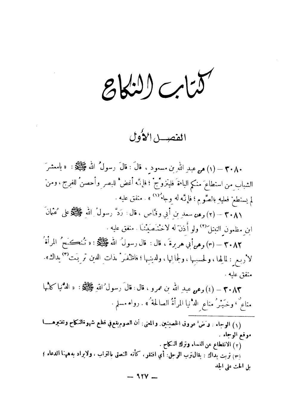 عَنْ عَبْدِ اللَّهِ بْنِ مَسْعُودٍ قَالَ: قَالَ رَسُولُ اللَّهِ صَلَّى اللَّهُ عَلَيْهِ وَسَلَّمَ: «يَا مَعْشَرَ الشَّبَابِ مَنِ اسْتَطَاعَ مِنْكُمُ الْبَاءَةَ فَلْيَتَزَوَّجْ فَإِنَّهُ أَغَضُّ لِلْبَصَرِ وَأَحْصَنُ لِلْفَرْجِ وَمَنْ لَمْ يَسْتَطِعْ فَعَلَيْهِ بِالصَّوْمِ فَإِنَّهُ لَهُ وِجَاءٌ»