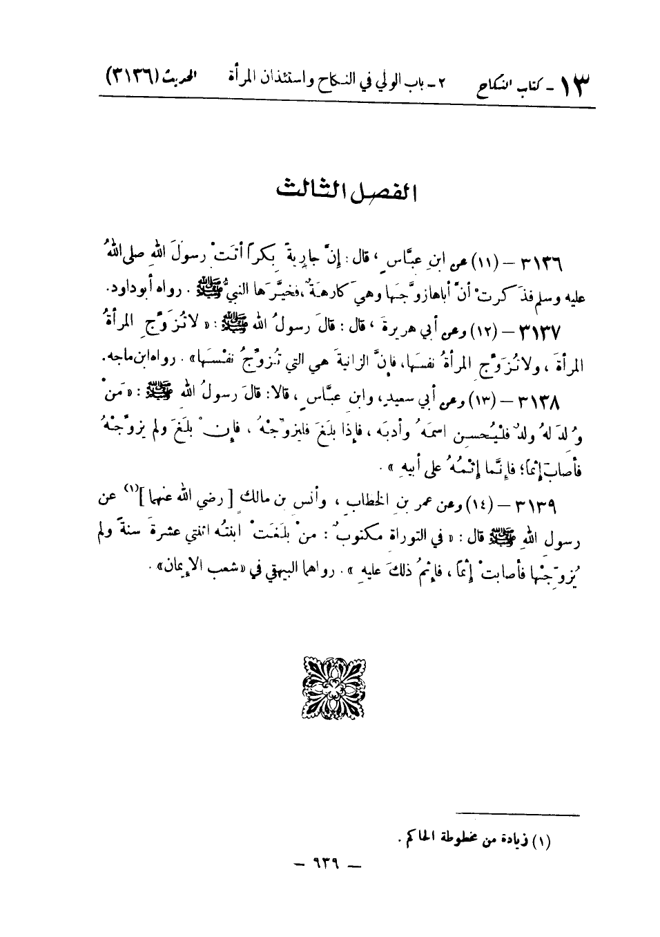 وَعَنْ عُمَرَ بْنِ الْخَطَّابِ وَأَنَسِ بْنِ مَالِكٍ رَضِيَ اللَّهُ عَنْهُ عَنْ رَسُولِ اللَّهِ صَلَّى اللَّهُ عَلَيْهِ وَسَلَّمَ قَالَ: " فِي التَّوْرَاةِ مَكْتُوبٌ: مَنْ بَلَغَتِ ابْنَتُهُ اثْنَتَيْ عَشْرَةَ سَنَةً وَلَمْ يُزَوِّجْهَا فَأَصَابَتْ إِثْمًا فَإِثْمُ ذَلِكَ عَلَيْهِ «. رَوَاهُمَا الْبَيْهَقِيُّ فِي» شُعَبِ الْإِيمَانِ "