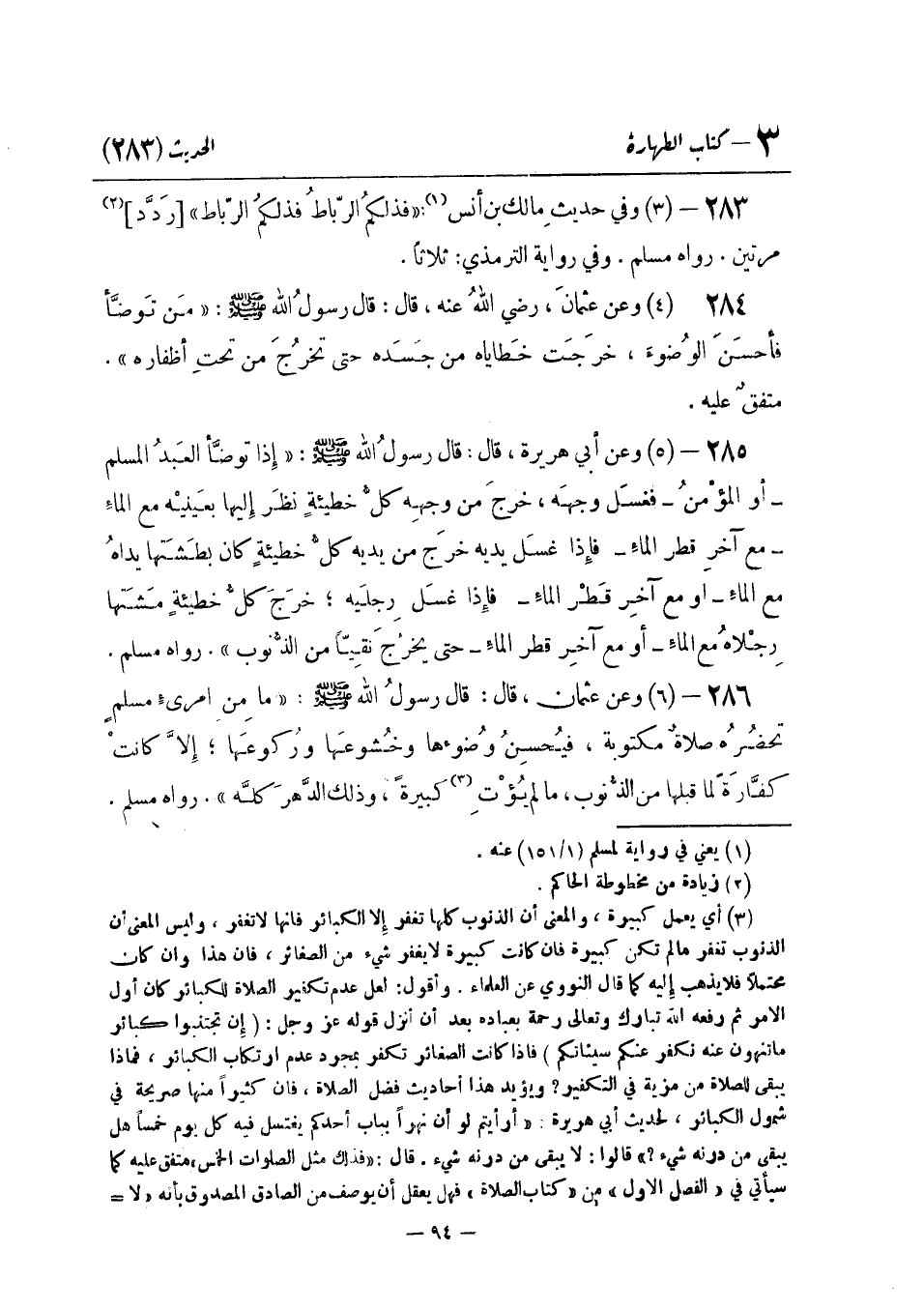 283 -[3] وَفِي حَدِيث مَالك بن أنس: «فَذَلِك الرِّبَاطُ فَذَلِكُمُ الرِّبَاطُ» . رَدَّدَ مَرَّتَيْنِ. رَوَاهُ مُسْلِمٌ. وَفِي رِوَايَة التِّرْمِذِيّ ثَلَاثًا
