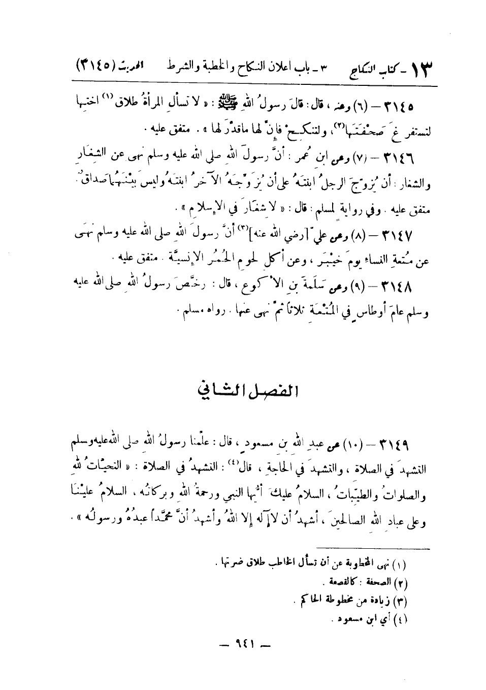 عَنْ عَبْدِ اللَّهِ بْنِ مَسْعُودٍ قَالَ: عَلَّمَنَا رَسُولُ اللَّهِ صَلَّى اللَّهُ عَلَيْهِ وَسَلَّمَ التَّشَهُّدَ فِي الصَّلَاةِ وَالتَّشَهُّدَ فِي الْحَاجَةِ قَالَ: التَّشَهُّدُ فِي الصَّلَاةِ: «التَّحِيَّاتُ لِلَّهِ وَالصَّلَوَاتُ وَالطَّيِّبَاتُ السَّلَامُ عَلَيْكَ أَيُّهَا النَّبِيُّ وَرَحْمَةُ اللَّهِ وَبَرَكَاتُهُ السَّلَامُ عَلَيْنَا وَعَلَى عِبَادِ اللَّهِ الصَّالِحِينَ أَشْهَدُ أَنْ لَا إِلَهَ إِلَّا اللَّهُ وَأَشْهَدُ أَنَّ مُحَمَّدًا عَبْدُهُ وَرَسُولُهُ» . -[942]- وَالتَّشَهُّدُ فِي الْحَاجَةِ: «إِنَّ الْحَمْدَ لِلَّهِ نَسْتَعِينُهُ وَنَسْتَغْفِرُهُ وَنَعُوذُ بِاللَّهِ مِنْ شُرُورِ أَنْفُسنَا من يهد اللَّهُ فَلَا مُضِلَّ لَهُ وَمَنْ يُضْلِلْ فَلَا هَادِيَ لَهُ وَأَشْهَدُ أَنْ لَا إِلَهَ إِلَّا اللَّهُ وَأَشْهَدُ أَنَّ مُحَمَّدًا عَبْدُهُ وَرَسُولُهُ» . وَيَقْرَأُ ثَلَاثَ آيَاتٍ (يَا أَيُّهَا الَّذِينَ آمَنُوا اتَّقُوا اللَّهَ حَقَّ تُقَاتِهِ وَلَا تَمُوتُنَّ إِلَّا وَأَنْتُمْ مُسلمُونَ)