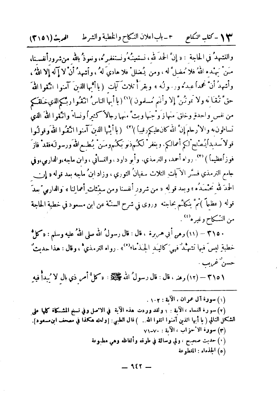 وَعَنْ أَبِي هُرَيْرَةَ قَالَ: قَالَ رَسُولُ اللَّهِ صَلَّى اللَّهُ عَلَيْهِ وَسَلَّمَ: «كُلُّ خُطْبَةٍ لَيْسَ فِيهَا تَشَهُّدٌ فَهِيَ كَالْيَدِ الْجَذْمَاءِ» . رَوَاهُ التِّرْمِذِيُّ وَقَالَ: هَذَا حَدِيثٌ حَسَنٌ غَرِيبٌ