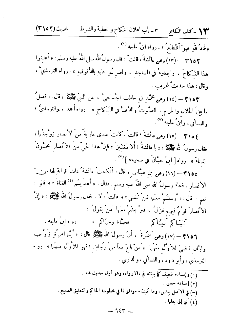 وَعَنْ مُحَمَّدِ بْنِ حَاطِبٍ الْجُمَحِيِّ عَنِ النَّبِيِّ صَلَّى اللَّهُ عَلَيْهِ وَسَلَّمَ قَالَ: " فَصَلَ مَا بَيْنَ الْحَلَالِ وَالْحَرَامِ: الصَّوْتُ وَالدُّفُّ فِي النِّكَاحِ ". رَوَاهُ أَحْمد وَالتِّرْمِذِيّ وَالنَّسَائِيّ وَابْن مَاجَه