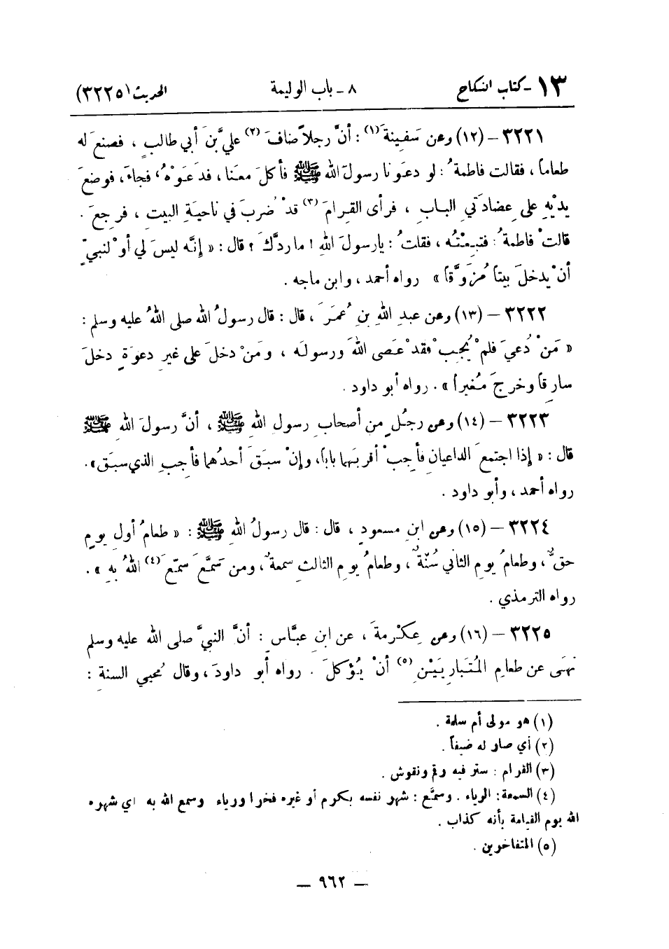 قَالَ: قَالَ رَسُولُ اللَّهِ صَلَّى اللَّهُ عَلَيْهِ وَسَلَّمَ: «طَعَامُ أَوَّلِ يَوْمٍ حق وَطَعَام يَوْم الثَّانِي سنة وَطَعَام يَوْم الثَّالِثِ سُمْعَةٌ وَمَنْ سَمَّعَ سَمَّعَ اللَّهُ بِهِ» . رَوَاهُ التِّرْمِذِيّ