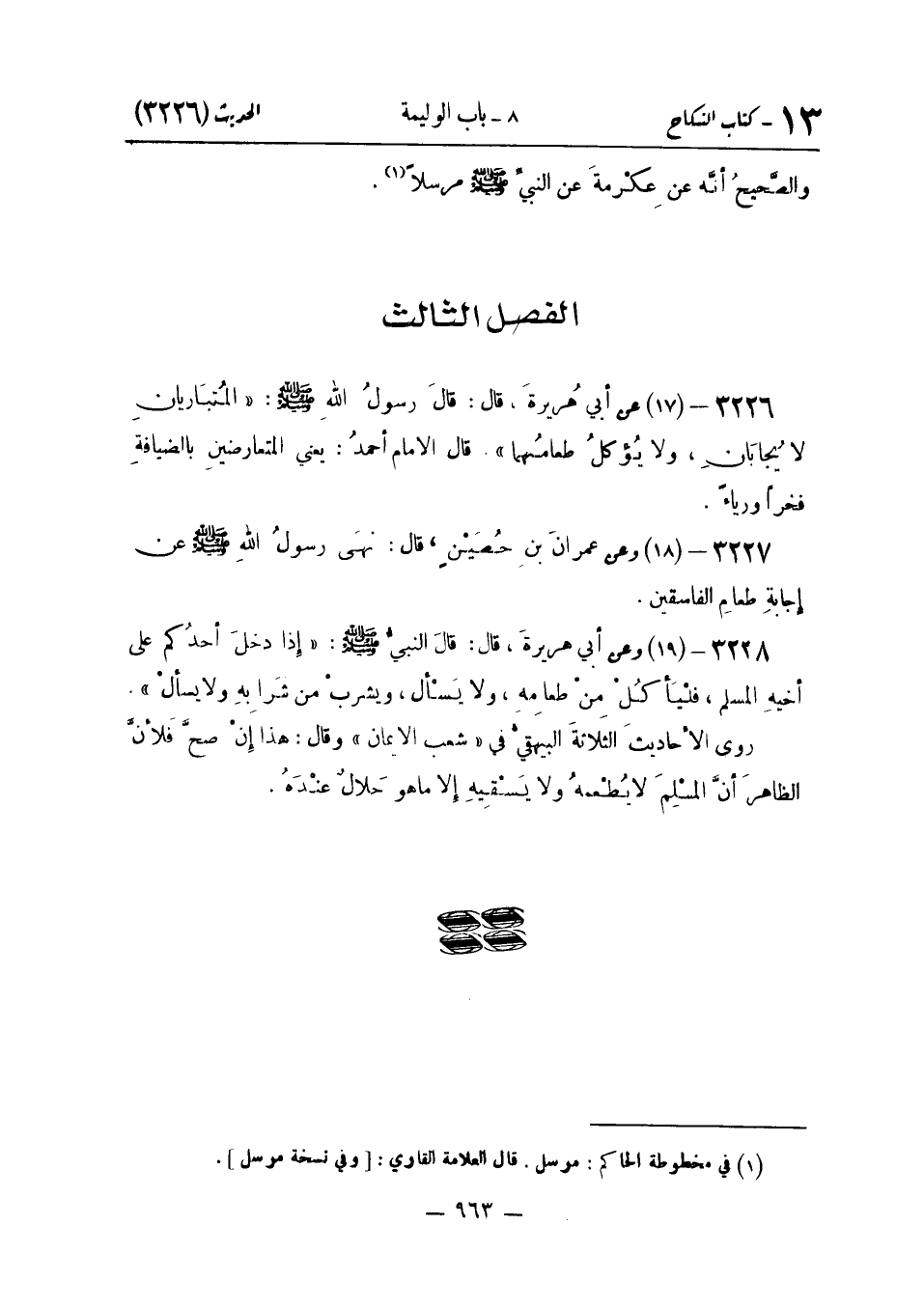 وَعَن عمرَان ين حُصَيْنٍ قَالَ: نَهَى رَسُولُ اللَّهِ صَلَّى اللَّهُ عَلَيْهِ وَسَلَّمَ إِجَابَة طَعَام الْفَاسِقين