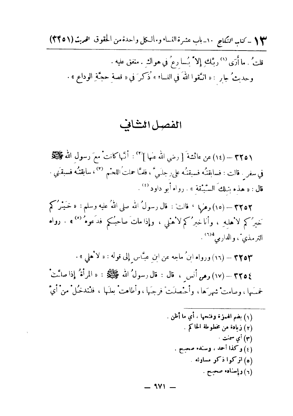 عَن عَائِشَة رَضِي الله عَنْهَا أَنَّهَا كَانَتْ مَعَ رَسُولِ اللَّهِ صَلَّى اللَّهُ عَلَيْهِ وَسَلَّمَ فِي سَفَرٍ قَالَتْ: فَسَابَقْتُهُ فَسَبَقْتُهُ عَلَى رِجْلَيَّ فَلَمَّا حَمَلْتُ اللَّحْمَ سَابَقْتُهُ فَسَبَقَنِي قَالَ: «هَذِهِ بِتِلْكَ السَّبْقَةِ» . رَوَاهُ أَبُو دَاوُدَ