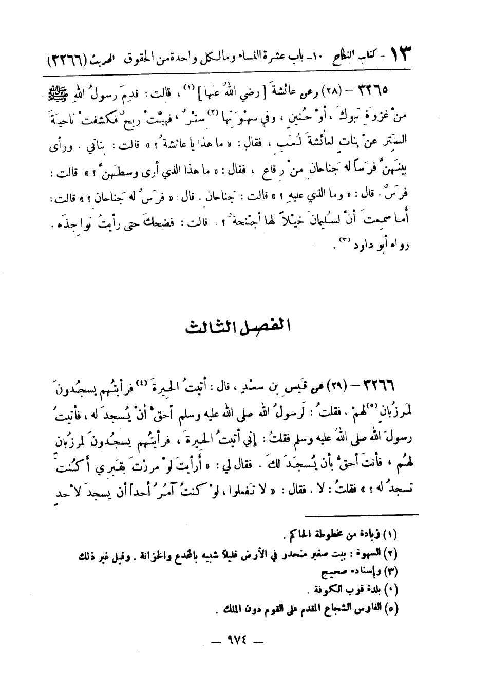 وَعَنْ عَائِشَةَ رَضِيَ اللَّهُ عَنْهَا قَالَتْ: قَدِمَ رَسُولُ اللَّهِ صَلَّى اللَّهُ عَلَيْهِ وَسَلَّمَ مَنْ غَزْوَة تَبُوك أَو حنين وَفِي سَهْوَتِهَا سِتْرٌ فَهَبَّتْ رِيحٌ فَكَشَفَتْ نَاحِيَةَ السِّتْرِ عَنْ بَنَاتٍ لِعَائِشَةَ لُعَبٍ فَقَالَ: «مَا هَذَا يَا عَائِشَةُ؟» قَالَتْ: بَنَاتِي وَرَأَى بَيْنَهُنَّ فَرَسًا لَهُ جَنَاحَانِ مِنْ رِقَاعٍ فَقَالَ: «مَا هَذَا الَّذِي أَرَى وَسْطَهُنَّ؟» قَالَتْ: فَرَسٌ قَالَ: «وَمَا الَّذِي عَلَيْهِ؟» قَالَتْ: جَنَاحَانِ قَالَ: «فَرَسٌ لَهُ جَنَاحَانِ؟» قَالَتْ: أَمَا سَمِعْتَ أَنَّ لِسُلَيْمَانَ خَيْلًا لَهَا أَجْنِحَةٌ؟ قَالَتْ: فَضَحِكَ حَتَّى رَأَيْتُ نَوَاجِذَهُ. رَوَاهُ أَبُو دَاوُد