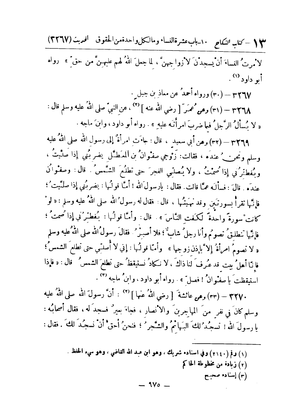 وَعَنْ أَبِي سَعِيدٍ قَالَ: جَاءَتِ امْرَأَةٌ إِلَى رَسُولِ اللَّهِ صَلَّى اللَّهُ عَلَيْهِ وَسَلَّمَ وَنَحْنُ عِنْده فَقَالَت: زَوْجِي صَفْوَانُ بْنُ الْمُعَطَّلِ يَضْرِبُنِي إِذَا صَلَّيْتُ وَيُفَطِّرُنِي إِذَا صُمْتُ وَلَا يُصَلِّي الْفَجْرَ حَتَّى تَطْلُعَ الشَّمْسُ قَالَ: وَصَفْوَانُ عِنْدَهُ قَالَ: فَسَأَلَهُ عَمَّا قَالَت فَقَالَ: يَا رَسُولَ اللَّهِ أَمَّا قَوْلُهَا: يَضْرِبُنِي إِذَا صَلَّيْتُ فَإِنَّهَا تَقْرَأُ بِسُورَتَيْنِ وَقَدْ نَهَيْتُهَا قَالَ: فَقَالَ رَسُولُ اللَّهِ صَلَّى اللَّهُ عَلَيْهِ وَسَلَّمَ: «لَوْ كَانَتْ سُورَةً وَاحِدَةً لَكَفَتِ النَّاسَ» . قَالَ: وَأَمَّا قَوْلُهَا يُفَطِّرُنِي إِذَا صُمْتُ فَإِنَّهَا تَنْطَلِقُ تَصُوم وَأَنا رجل شَاب فَلَا أَصْبِر فَقَالَ رَسُولُ اللَّهِ صَلَّى اللَّهُ عَلَيْهِ وَسَلَّمَ: «لَا تَصُومُ امْرَأَةٌ إِلَّا بِإِذْنِ زَوْجِهَا» وَأَمَّا قَوْلُهَا: إِنِّي لَا أُصَلِّي حَتَّى تَطْلُعَ الشَّمْسُ فَإنَّا أهل بَيت قد عرف لنا ذَاك لَا نَكَادُ نَسْتَيْقِظُ حَتَّى تَطْلُعَ الشَّمْسُ قَالَ: «فَإِذَا اسْتَيْقَظْتَ يَا صَفْوَانُ فَصَلِّ» . رَوَاهُ أَبُو دَاوُد وَابْن مَاجَه
