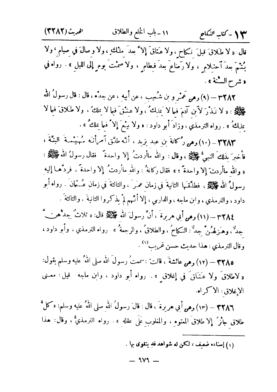 وَعَنْ أَبِي هُرَيْرَةَ قَالَ: قَالَ رَسُولُ اللَّهِ صَلَّى اللَّهُ عَلَيْهِ وَسَلَّمَ: «كُلُّ طَلَاقٍ جَائِزٌ إِلَّا طَلَاقَ الْمَعْتُوهِ وَالْمَغْلُوبِ عَلَى عَقْلِهِ» . رَوَاهُ التِّرْمِذِيُّ وَقَالَ: هَذَا -[980]- حَدِيثٌ غَرِيبٌ وَعَطَاءُ بْنُ عجلانَ الرَّاوي ضعيفٌ ذاهبُ الحَدِيث
