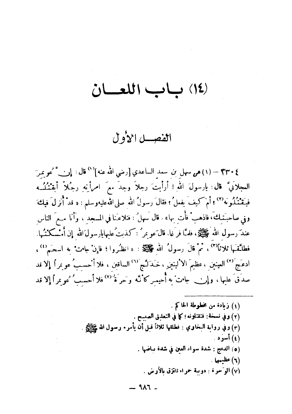 عَنْ سَهْلِ بْنِ سَعْدٍ السَّاعِدِيِّ رَضِيَ اللَّهُ عَنهُ قَالَ: إِن عُوَيْمِر الْعَجْلَانِيَّ قَالَ: يَا رَسُولَ اللَّهِ أَرَأَيْتَ رَجُلًا وجدَ معَ امرأتِهِ رجُلاً أيقْتُلُه فيَقْتُلُونه؟ أمْ كَيفَ أفعل؟ فَقَالَ رَسُولُ اللَّهِ صَلَّى اللَّهُ عَلَيْهِ وَسَلَّمَ: «قدْ أُنْزِلُ فِيكَ وَفِي صَاحِبَتِكَ فَاذْهَبْ فَأْتِ بِهَا» قَالَ سَهْلٌ: فَتَلَاعَنَا فِي الْمَسْجِدِ وَأَنَا مَعَ النَّاسِ عِنْدَ رَسُولِ اللَّهِ صَلَّى اللَّهُ عَلَيْهِ وَسَلَّمَ فَلَمَّا فَرَغَا قَالَ عُوَيْمِرٌ: كَذَبْتُ عَلَيْهَا يَا رسولَ اللَّهِ إِن أَمْسكْتُها فطلقتها ثَلَاثًا ثُمَّ قَالَ رَسُولُ اللَّهِ صَلَّى اللَّهُ عَلَيْهِ وَسَلَّمَ: " انْظُرُوا فَإِنْ جَاءَتْ بِهِ أَسْحَمَ أَدْعَجَ الْعَيْنَيْنِ عَظِيمَ الْأَلْيَتَيْنِ خَدَلَّجَ السَّاقَيْنِ فَلَا أَحسب عُوَيْمِر إِلَّا قَدْ صَدَقَ عَلَيْهَا وَإِنْ جَاءَتْ بِهِ أُحَيْمِرَ كَأَنَّهُ وَحَرَةٌ فَلَا أَحْسِبُ عُوَيْمِرًا إِلَّا قَدْ -[987]- كَذَبَ عَلَيْهَا فَجَاءَتْ بِهِ عَلَى النَّعْتِ الَّذِي نَعْتُ رَسُولِ اللَّهِ صَلَّى اللَّهُ عَلَيْهِ وَسَلَّمَ مِنْ تَصْدِيقِ عُوَيْمِرٍ فَكَانَ بَعْدُ يُنْسَبُ إِلَى أمه
