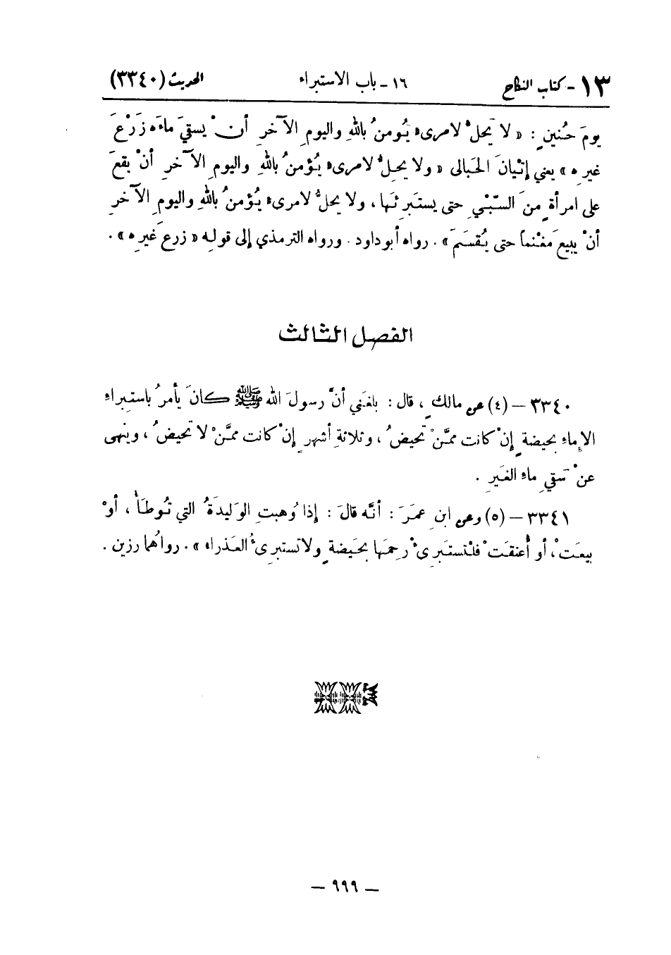 عَن مَالِكٍ قَالَ: بَلَغَنِي أَنَّ رَسُولَ اللَّهِ صَلَّى اللَّهُ عَلَيْهِ وَسَلَّمَ كَانَ يَأْمُرُ بِاسْتِبْرَاءِ الْإِمَاءِ بِحَيْضَةٍ إِنْ كَانَتْ مِمَّنْ تَحِيضُ وَثَلَاثَةِ أَشْهُرٍ إِنْ كَانَت مِمَّن تحيض وَينْهى عَن سقِِي مَاء الْغَيْر