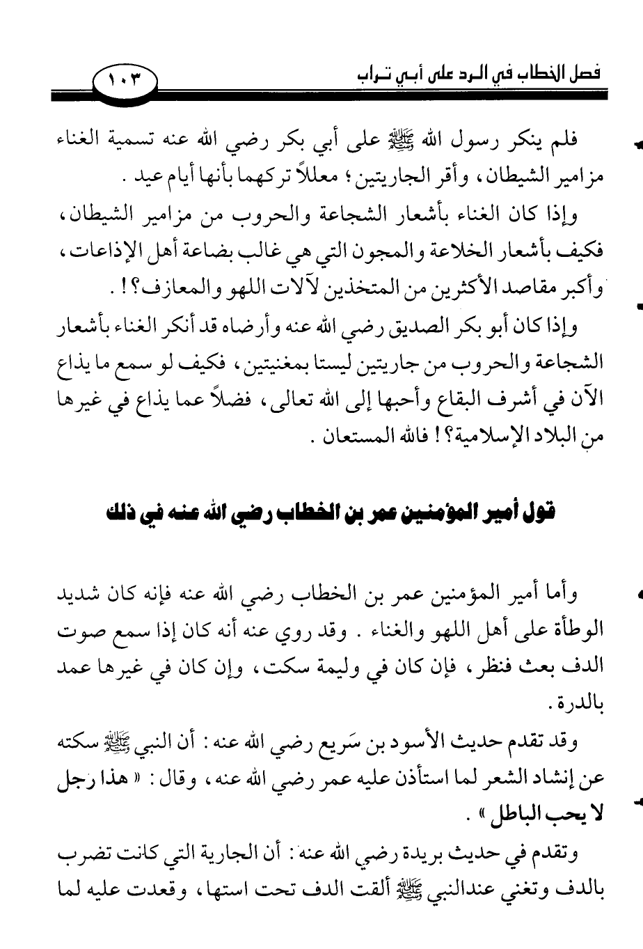 وأما أمير المؤمنين عمر بن الخطاب رضي الله عنه فإنه كان شديد الوطأة على أهل اللهو والغناء. وقد روي عنه أنه كان إذا سمع صوت الدف بعث فنظر، فإن كان في وليمة سكت، وإن كان في غيرها عمد بالدرة.