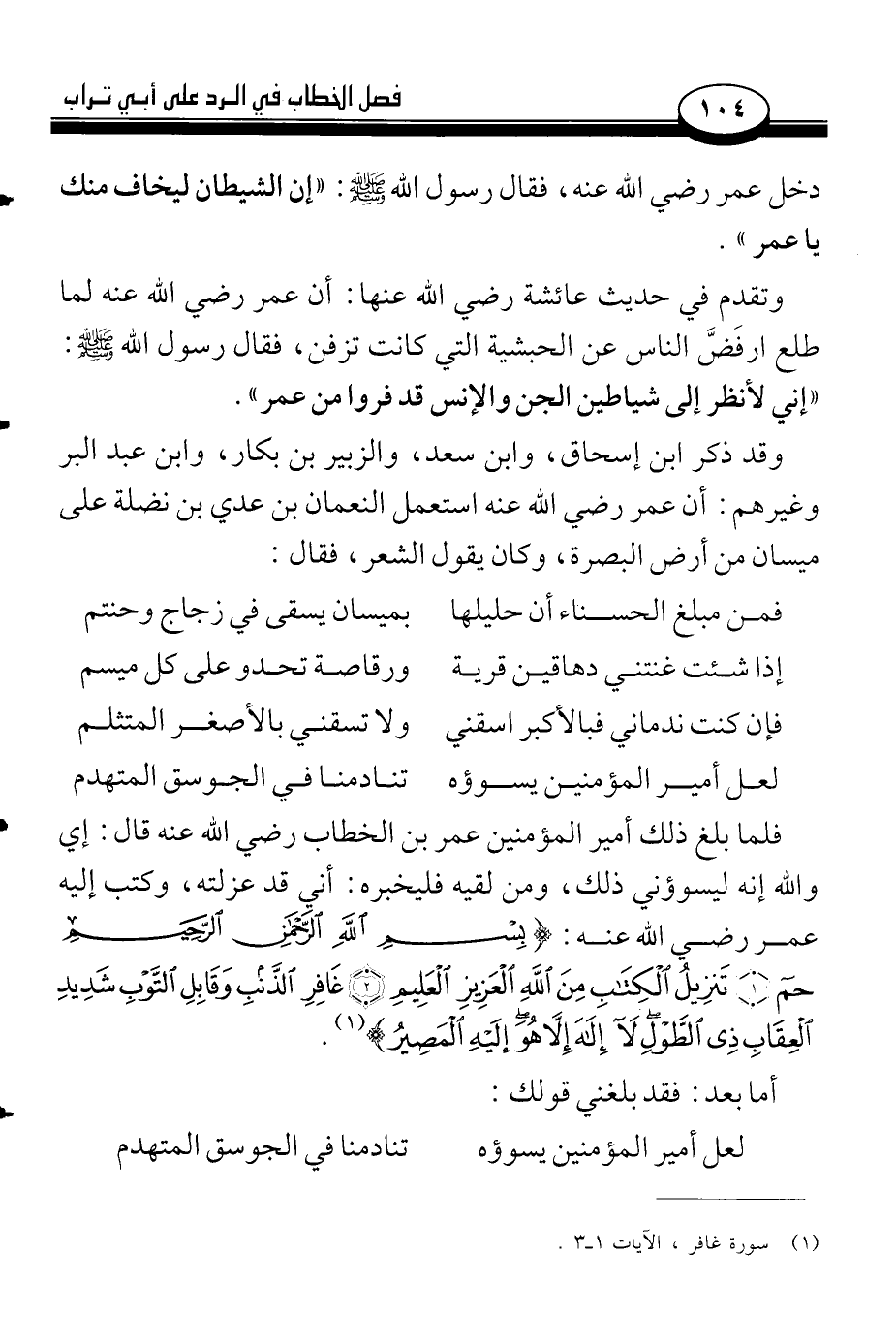 فلما بلغ ذلك أمير المؤمنين عمر بن الخطاب رضي الله عنه قال: إي والله إنه ليسوؤني ذلك، ومن لقيه فليخبره: أني قد عزلته، وكتب إليه عمر رضي الله عنه: {بِسْمِ اللهِ الرَّحْمنِ الرَّحِيمِ حم (1) تَنزِيلُ الْكِتَابِ مِنَ اللَّهِ الْعَزِيزِ الْعَلِيمِ (2) غَافِرِ الذَّنبِ وَقَابِلِ التَّوْبِ شَدِيدِ الْعِقَابِ ذِي الطَّوْلِ لَا إِلَهَ إِلَّا هُوَ إِلَيْهِ الْمَصِيرُ} (¬1).