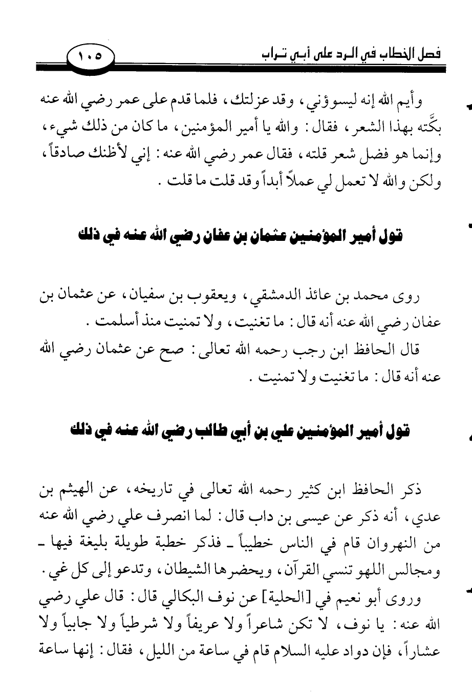 ذكر الحافظ ابن كثير رحمه الله تعالى في تاريخه، عن الهيثم بن عدي، أنه ذكر عن عيسى بن داب قال: لما انصرف علي رضي الله عنه من النهروان قام في الناس خطيباً - فذكر خطبة طويلة بليغة فيها - ومجالس اللهو تنسي القرآن، ويحضرها الشيطان، وتدعو إلى كل غي.