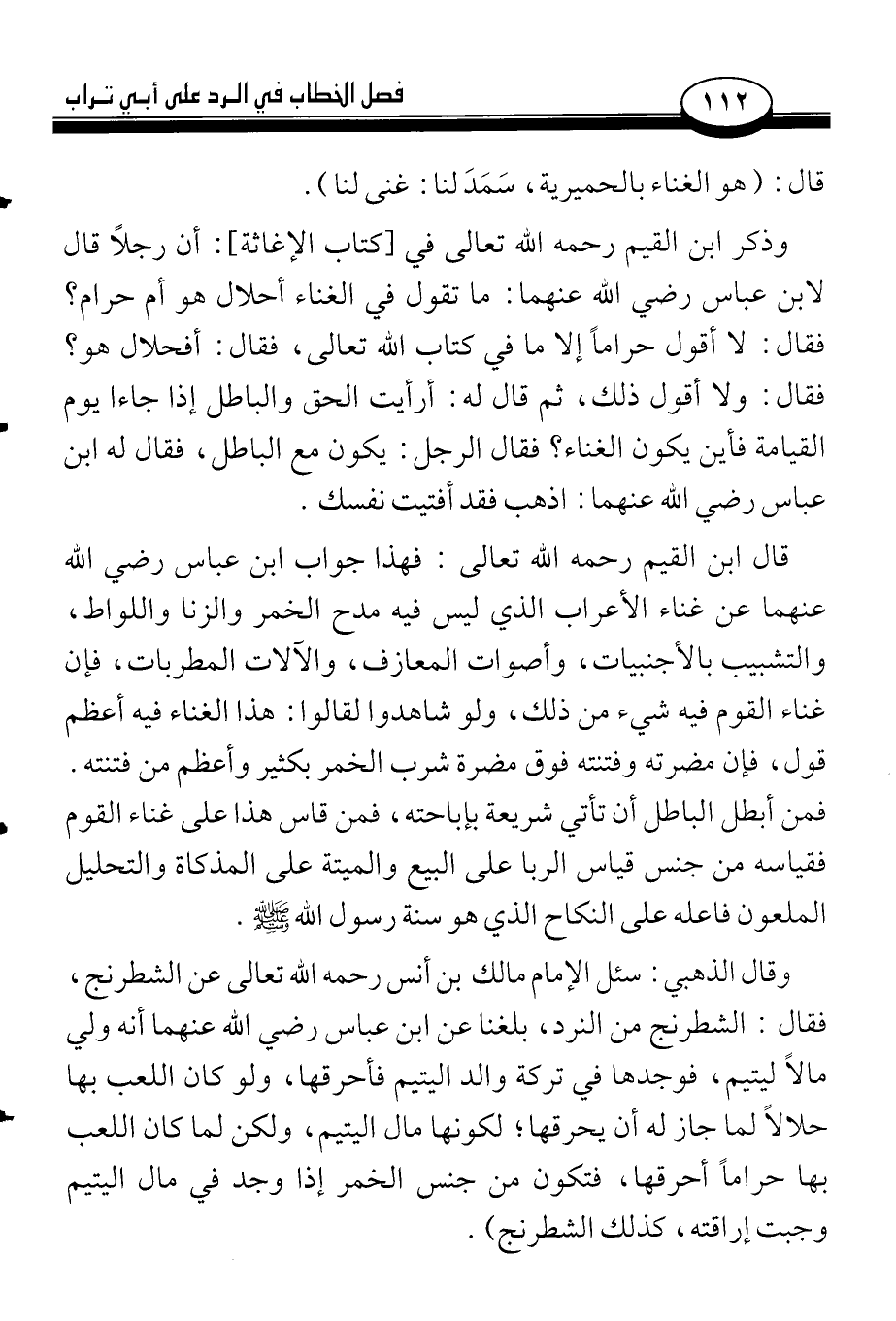 قال ابن القيم رحمه الله تعالى: فهذا جواب ابن عباس رضي الله عنهما عن غناء الأعراب الذي ليس فيه مدح الخمر والزنا واللواط، والتشبيب بالأجنبيات، وأصوات المعازف، والآلات المطربات، فإن غناء القوم فيه شيء من ذلك، ولو شاهدوا لقالوا: هذا الغناء فيه أعظم قول، فإن مضرته وفتنته فوق مضرة شرب الخمر بكثير وأعظم من فتنته. فمن أبطل الباطل أن تأتي شريعة بإباحته، فمن قاس هذا على غناء القوم فقياسه من جنس قياس الربا على البيع والميتة على المذكاة والتحليل الملعون فاعله على النكاح الذي هو سنة رسول الله صلى الله عليه وسلم.