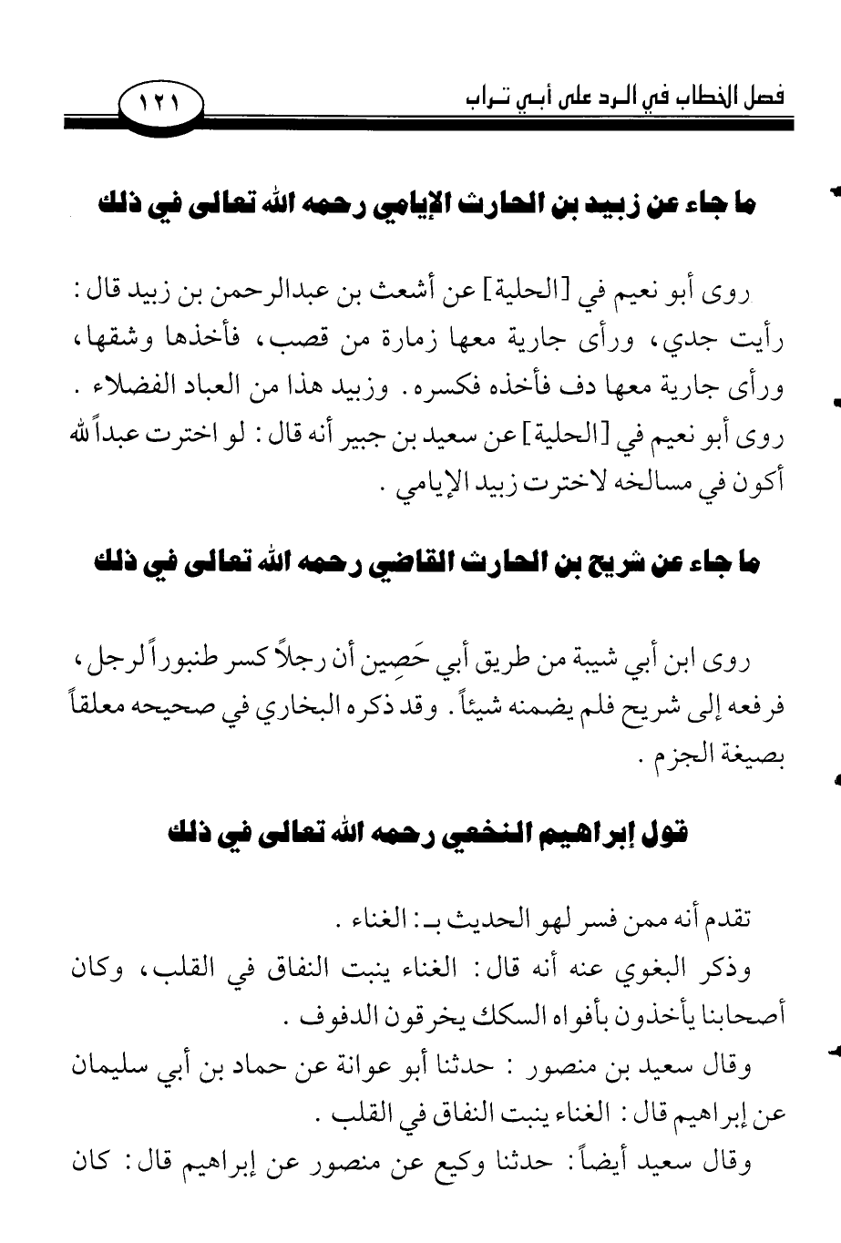 وقال سعيد بن منصور: حدثنا أبو عوانة عن حماد بن أبي سليمان عن إبراهيم قال: الغناء ينبت النفاق في القلب.