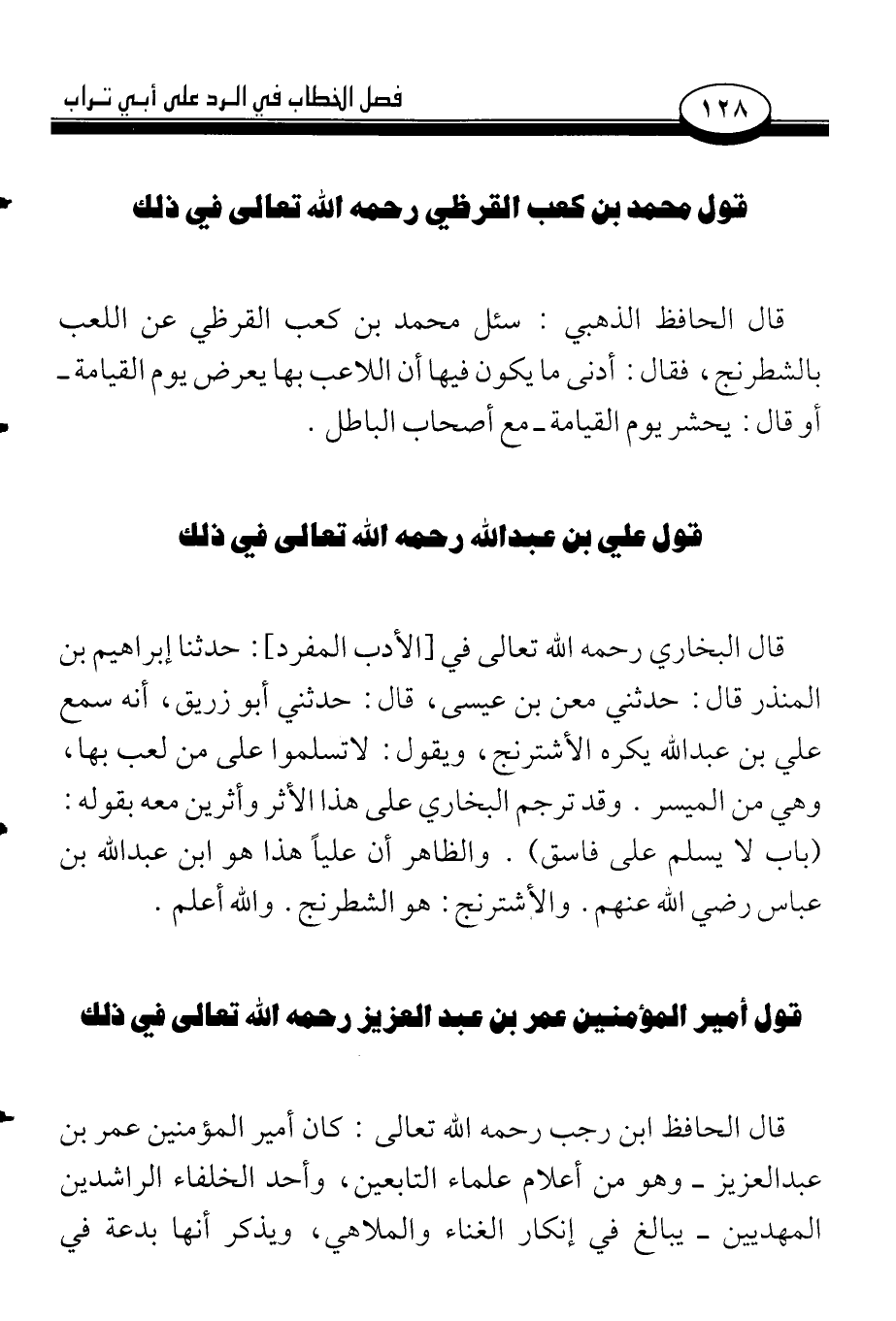 قال الحافظ الذهبي: سئل محمد بن كعب القرظي عن اللعب بالشطرنج، فقال: أدنى ما يكون فيها أن اللاعب بها يعرض يوم القيامة - أو قال: يحشر يوم القيامة - مع أصحاب الباطل.