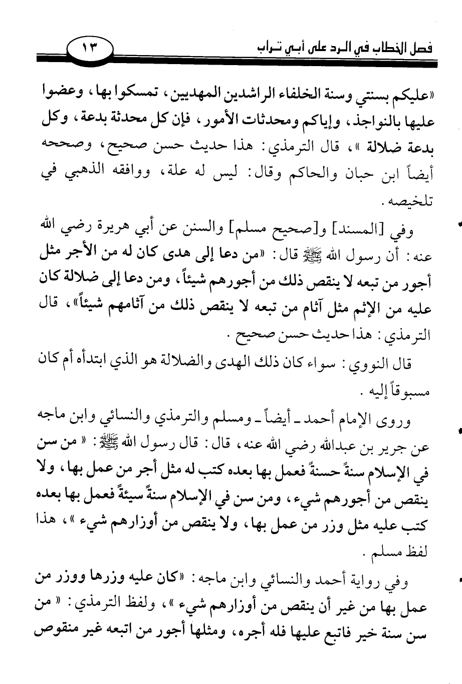 «عليكم بسنتي وسنة الخلفاء الراشدين المهديين، تمسكوا بها، وعضوا عليها بالنواجذ، وإياكم ومحدثات الأمور، فإن كل محدثة بدعة، وكل بدعة ضلالة»، قال الترمذي: هذا حديث حسن صحيح، وصححه أيضاً ابن حبان والحاكم وقال: ليس له علة، ووافقه الذهبي في تلخيصه.