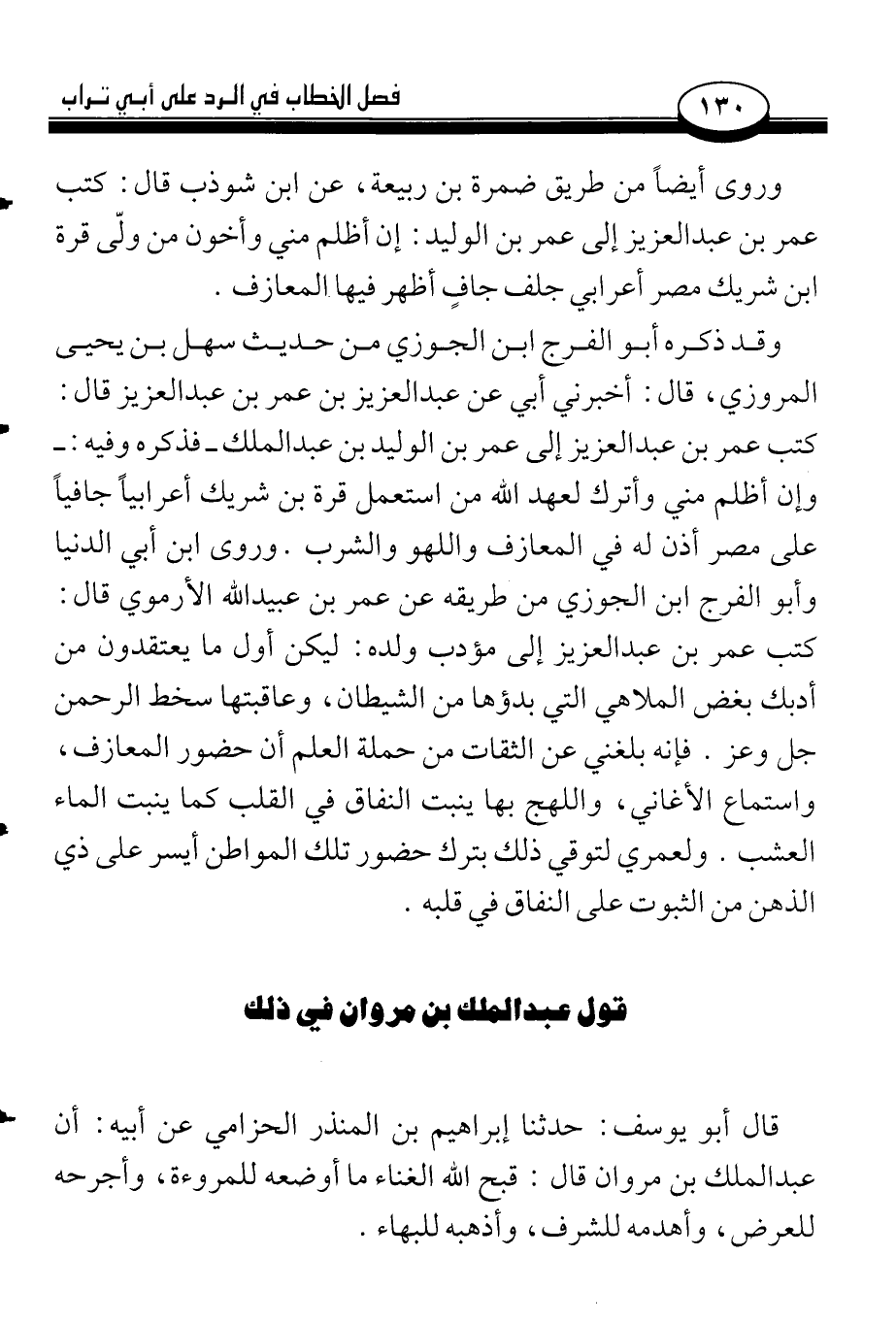 وقد ذكره أبو الفرج ابن الجوزي من حديث سهل بن يحيى المروزي، قال: أخبرني أبي عبد العزيز بن عمر بن عبد العزيز قال: كتب عمر بن عبد العزيز إلى عمر بن الوليد بن عبد الملك - فذكره وفيه: - وإن أظلم مني وأترك لعهد الله من استعمل قرة بن شريك أعرابياً جافياً على مصر أذن له في المعازف واللهو والشرب. وروى ابن أبي الدنيا وأبو الفرج ابن الجوزي من طريقه عن عمر بن عبيد الله الأرموي قال: كتب عمر بن عبد العزيز إلى مؤدب ولده: ليكن أول ما يعتقدون من أدبك بغض الملاهي التي بدؤها من الشيطان، وعاقبتها سخط الرحمن جل وعز. فإنه بلغني عن الثقات من حملة العلم أن حضور المعازف، واستماع الأغاني، واللهج بها ينبت النفاق في القلب كما ينبت الماء العشب. ولعمري لتوقي ذلك بترك حضور تلك المواطن أيسر على ذي الذهن من الثبوت على النفاق في قلبه.