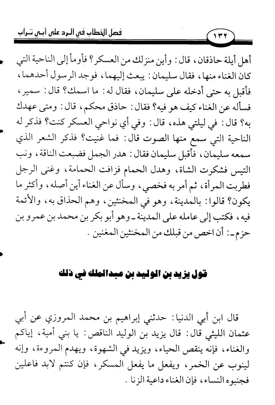 قال ابن أبي الدنيا: حدثني إبراهيم بن محمد المروزي عن أبي عثمان الليثي قال: قال يزيد بن الوليد الناقص: يا بني أمية، إياكم والغناء، فإنه ينقص الحياء، ويزيد في الشهوة، ويهدم المروءة، وإنه لينوب عن الخمر، ويفعل ما يفعل المسكر، فإن كنتم لابد فاعلين فجنبوه النساء، فإن الغناء داعية الزنا.