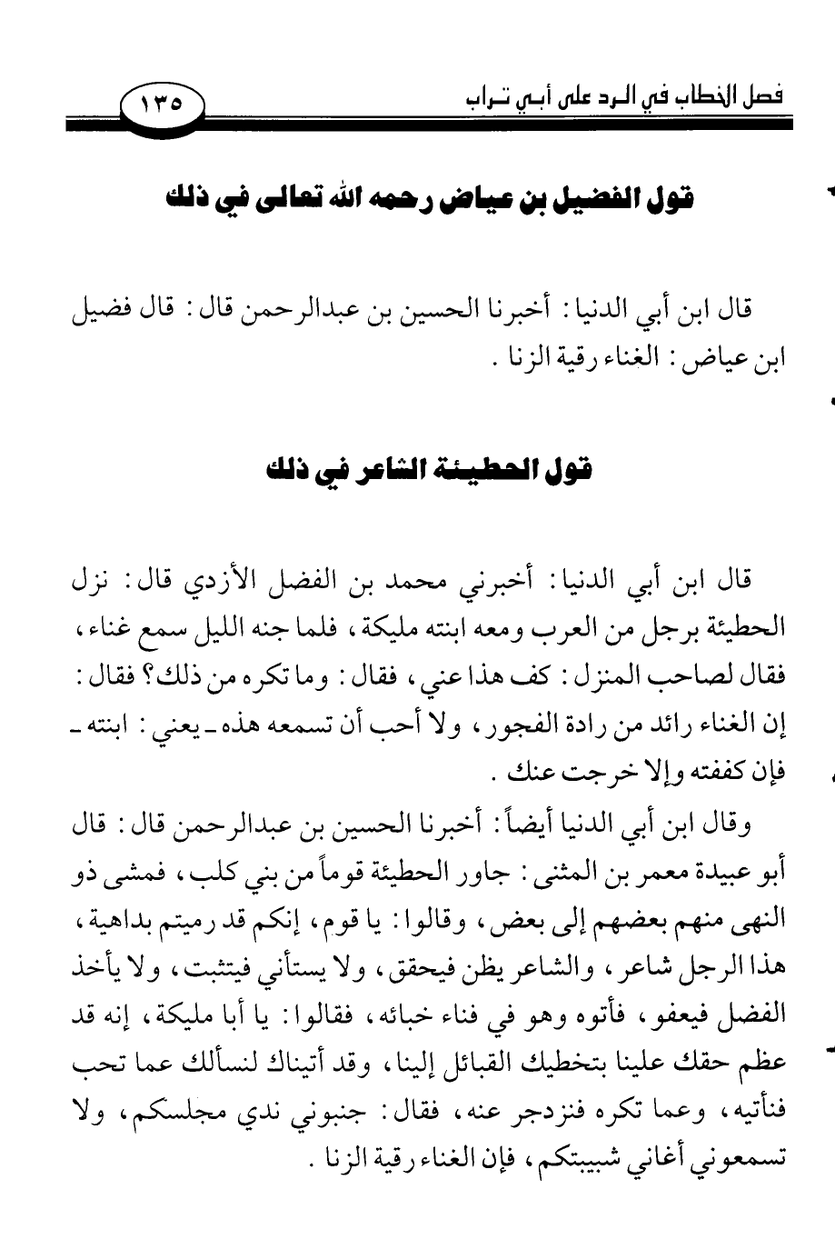 وقال ابن أبي الدنيا أيضاً: أخبرنا الحسين بن عبد الرحمن قال: قال أبو عبيدة معمر بن المثنى: جاور الحطيئة قوماً من بني كلب، فمشى ذو النهى منهم بعضهم إلى بعض، وقالوا: يا قوم، إنكم قد رميتم بداهية، هذا الرجل شاعر، والشاعر يظن فيحقق، ولا يستأني فيتثبت، ولا يأخذ الفضل فيعفو، فأتوه وهو في فناء خبائه، فقالوا: يا أبا مليكة، إنه قد عظم حقك علينا بتخطيك القبائل إلينا، وقد أتيناك لنسألك عما تحب فنأتيه، وعما تكره فنزدجر عنه، فقال: جنبوني ندي مجلسكم، ولا تسمعوني أغاني شبيبتكم، فإن الغناء رقية الزنا.