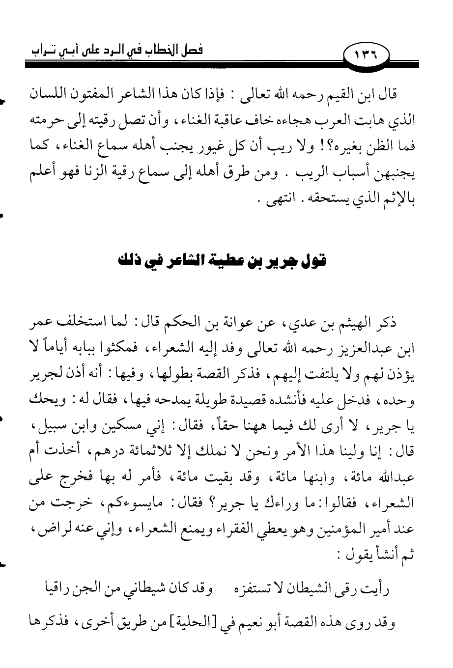 قال ابن القيم رحمه الله تعالى: فإذا كان هذا الشاعر المفتون اللسان الذي هابت العرب هجاءه خاف عاقبة الغناء، وأن تصل رقيته إلى حرمته فما الظن بغيره؟! ولا ريب أن كل غيور يجنب أهله سماع الغناء، كما يجنبهن أسباب الريب. ومن طرق أهله إلى سماع رقية الزنا فهو أعلم بالإثم الذي يستحقه. انتهى.