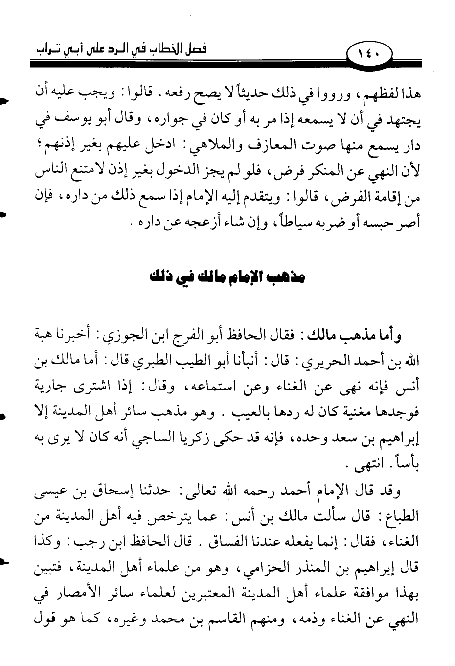 وقد قال الإمام أحمد رحمه الله تعالى: حدثنا إسحاق بن عيسى الطباع: قال سألت مالك بن أنس: عما يترخص فيه أهل المدينة من الغناء، فقال: إنما يفعله عندنا الفساق. قال الحافظ ابن رجب: وكذا قال إبراهيم بن المنذر الحزامي، وهو من علماء أهل المدينة، فتبين بهذا موافقة علماء أهل المدينة المعتبرين لعلماء سائر الأمصار في النهي عن الغناء وذمه، ومنهم القاسم بن محمد وغيره، كما هو قول