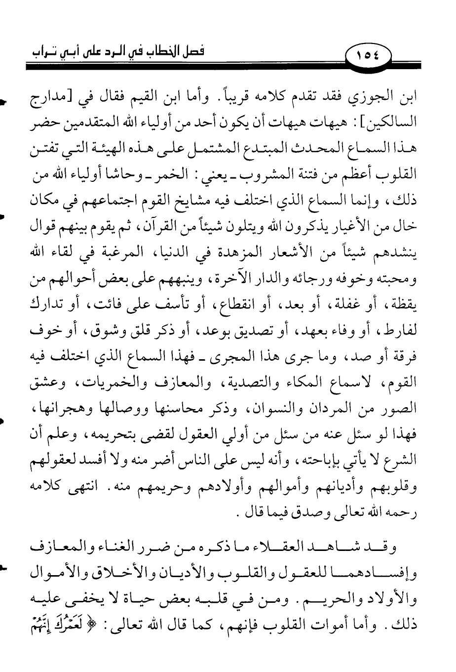 ابن الجوزي فقد تقدم كلامه قريباً. وأما ابن القيم فقال في [مدارج السالكين]: هيهات هيهات أن يكون أحد من أولياء الله المتقدمين حضر هذا السماع المحدث المبتدع المشتمل على هذه الهيئة التي تفتن القلوب أعظم من فتنة المشروب - يعني: الخمر - وحاشا أولياء الله من ذلك، وإنما السماع الذي اختلف فيه مشايخ القوم اجتماعهم في مكان خال من الأغيار يذكرون الله ويتلون شيئاً من القرآن، ثم يقوم بينهم قوال ينشدهم شيئاً من الأشعار المزهدة في الدنيا، المرغبة في لقاء الله ومحبته وخوفه ورجائه والدار الآخرة، وينبههم على بعض أحوالهم من يقظة، أو غفلة، أو بعد، أو انقطاع، أو تأسف على فائت، أو تدارك لفارط، أو وفاء بعهد، أو تصديق بوعد، أو ذكر قلق وشوق، أو خوف فرقة أو صد، وما جرى هذا المجرى - فهذا السماع الذي اختلف فيه القوم، لا سماع المكاء والتصدية، والمعازف والخمريات، وعشق الصور من المردان والنسوان، وذكر محاسنها ووصالها وهجرانها، فهذا لو سئل عنه من سئل من أولي العقول لقضى بتحريمه، وعلم أن الشرع لا يأتي بإباحته، وأنه ليس على الناس أضر منه ولا أفسد لعقولهم وقلوبهم وأديانهم وأموالهم وأولادهم وحريمهم منه. انتهى كلامه رحمه الله تعالى وصدق فيما قال.