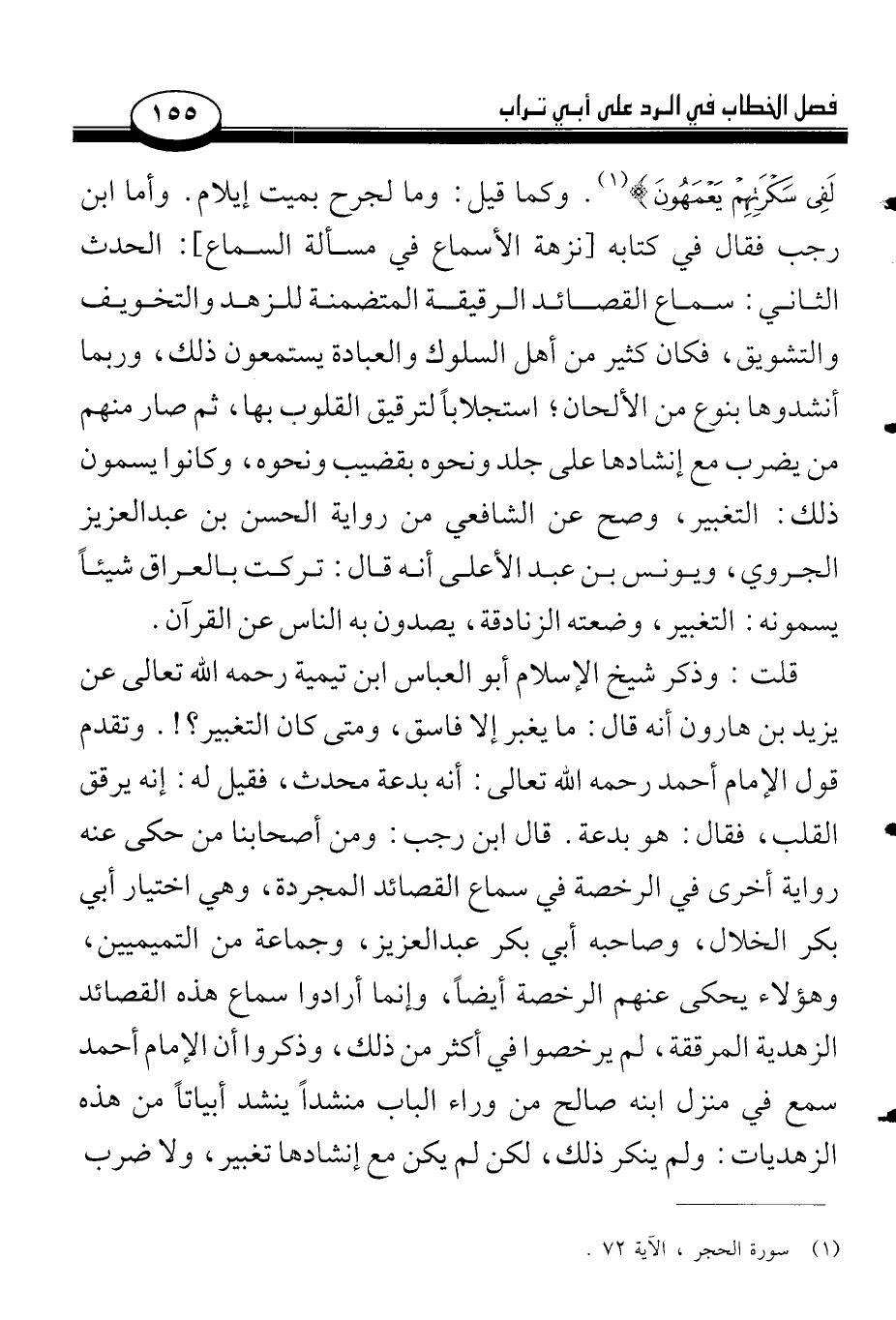 لَفِي سَكْرَتِهِمْ يَعْمَهُونَ} (¬1). وكما قيل: وما لجرح بميت إيلام. وأما ابن رجب فقال في كتابه [نزهة الأسماع في مسألة السماع]: الحدث الثاني: سماع القصائد الرقيقة المتضمنة للزهد والتخويف والتشويق، فكان كثير من أهل السلوك والعبادة يستمعون ذلك، وربما أنشدوها بنوع من الألحان؛ استجلاباً لترقيق القلوب بها، ثم صار منهم من يضرب مع إنشادها على جلد ونحوه بقضيب ونحوه، وكانوا يسمون ذلك التغبير، وصح عن الشافعي من رواية الحسن بن عبد العزيز الجروي، ويونس بن عبد الأعلى أنه قال: تركت بالعراق شيئاً يسمونه: التغبير، وضعته الزنادقة، يصدون به الناس عن القرآن.