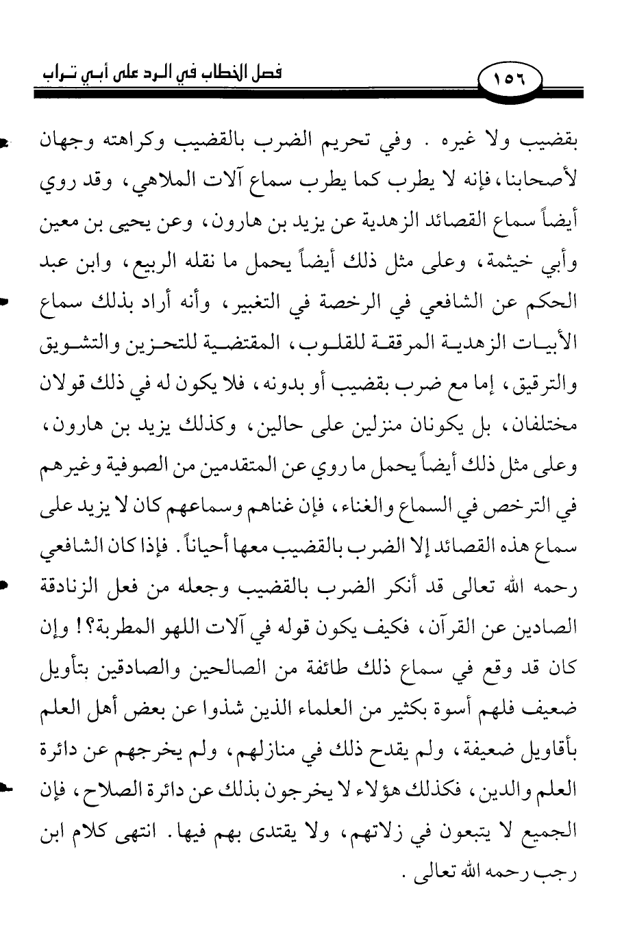 بقضيب ولا غيره. وفي تحريم الضرب بالقضيب وكراهته وجهان لأصحابنا، فإنه لا يطرب كما يطرب سماع آلات الملاهي، وقد روي أيضاً سماع القصائد الزهدية عن يزيد بن هارون، وعن يحيى بن معين وأبي خيثمة، وعلى مثل ذلك أيضاً يحمل ما نقله الربيع، وابن عبد الحكم عن الشافعي في الرخصة في التغبير، وأنه أراد بذلك سماع الأبيات الزهدية المرققة للقلوب، المقتضية للتحزين والتشويق والترقيق، إما مع ضرب بقضيب أو بدونه، فلا يكون له في ذلك قولان مختلفان، بل يكونان منزلين على حالين، وكذلك يزيد بن هارون، وعلى مثل ذلك أيضاً يحمل ما روي عن المتقدمين من الصوفية وغيرهم في الترخيص في السماع والغناء، فإن غناهم وسماعهم كان لا يزيد على سماع هذه القصائد إلا الضرب بالقضيب معها أحياناً. فإذا كان الشافعي رحمه الله تعالى قد أنكر الضرب بالقضيب وجعله من فعل الزنادقة الصادين عن القرآن، فكيف يكون قوله في آلات اللهو المطربة؟! وإن كان قد وقع في سماع ذلك طائفة من الصالحين والصادقين بتأويل ضعيف فلهم أسوة بكثير من العلماء الذين شذوا عن بعض أهل العلم بأقاويل ضعيفة، ولم يقدح ذلك في منازلهم، ولم يخرجهم عن دائرة العلم والدين، فكذلك هؤلاء لا يخرجون بذلك عن دائرة الصلاح، فإن الجميع لا يتبعون في زلاتهم، ولا يقتدي بهم فيها. انتهى كلام ابن رجب رحمه الله تعالى.