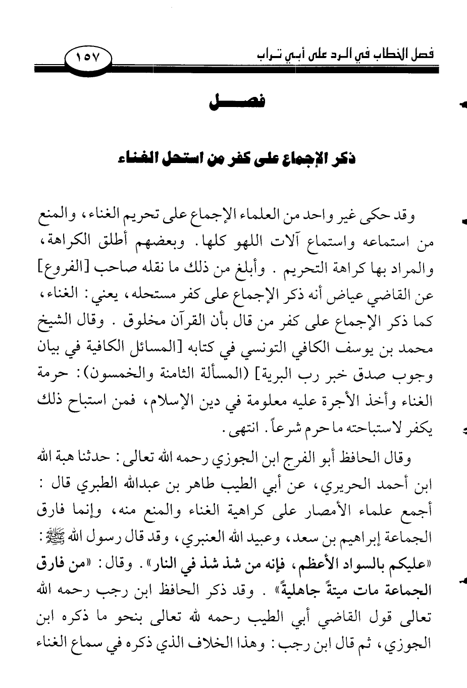 وقال الحافظ أبو الفرج ابن الجوزي رحمه الله تعالى: حدثنا هبة الله ابن أحمد الحريري، عن أبي الطيب طاهر بن عبد الله الطبري قال: أجمع علماء الأمصار على كراهية الغناء والمنع منه، وإنما فارق الجماعة إبراهيم بن سعد، وعبيد الله العنبري، وقد قال رسول الله صلى الله عليه وسلم: «عليكم بالسواد الأعظم، فإنه من شذ شذ في النار». وقال: «من فارق الجماعة مات ميتةً جاهليةً». وقد ذكر الحافظ ابن رجب رحمه الله تعالى قول القاضي أبي الطيب رحمه الله تعالى بنحوه ما ذكره ابن الجوزي، ثم قال ابن رجب: وهذا الخلاف الذي ذكره في سماع الغناء
