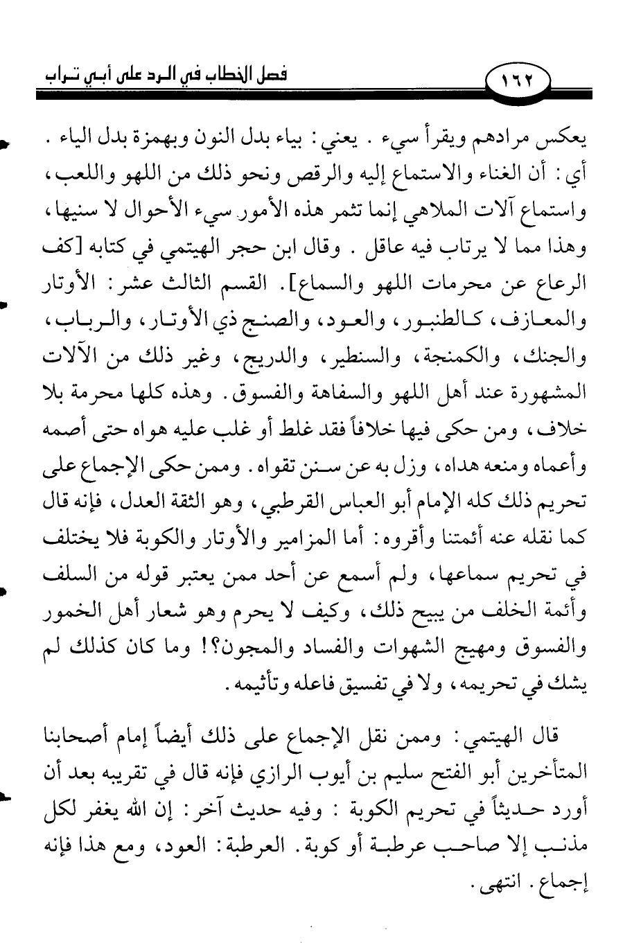 قال الهيتمي: وممن نقل الإجماع على ذلك أيضاً إمام أصحابنا المتأخرين أبو الفتح سليم بن أيوب الرازي فإنه قال في تقريبه بعد أن أورد حديثاً في تحريم الكوبة: وفيه حديث آخر: إن الله يغفر لكل مذنب إلا صاحب عرطبة أو كوبة. العرطبة: العود، ومع هذا فإنه إجماع. انتهى.